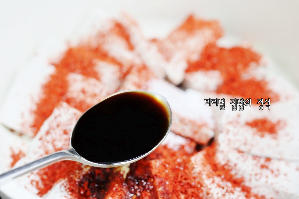 두부 위에 굵은 고춧가루 2숟가락, 양조간장 2숟가락, 새우젓 1숟가락,