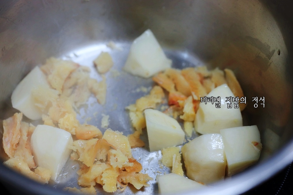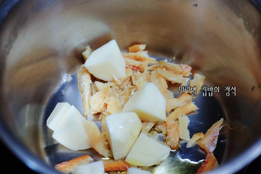 냄비에 들기름 1숟가락, 황태, 감자를 넣어 중불로 달달 볶아주세요~