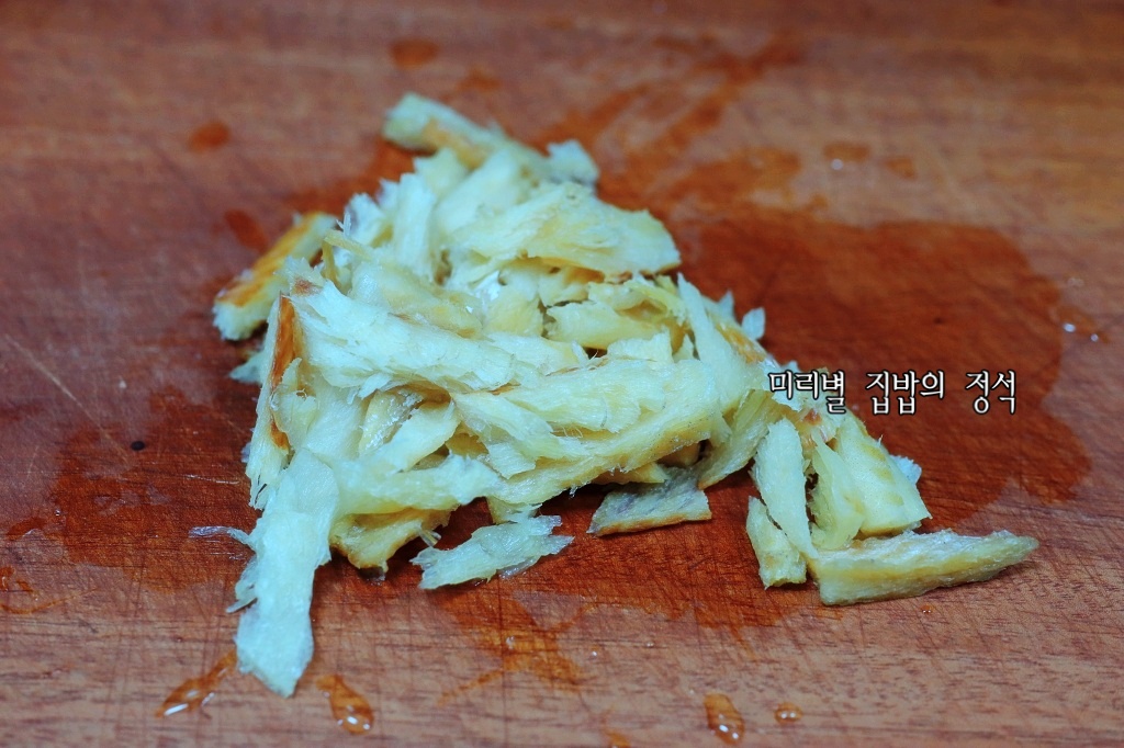 황태 한 줌은 물에 5분 정도 불린 후 물기를 꼭 짜서