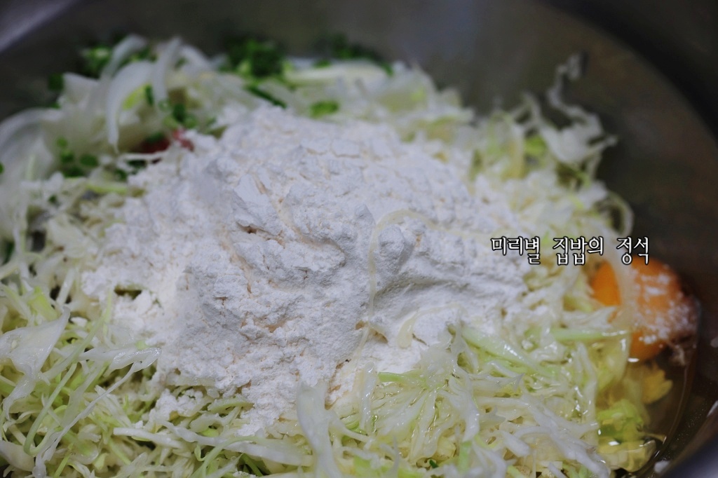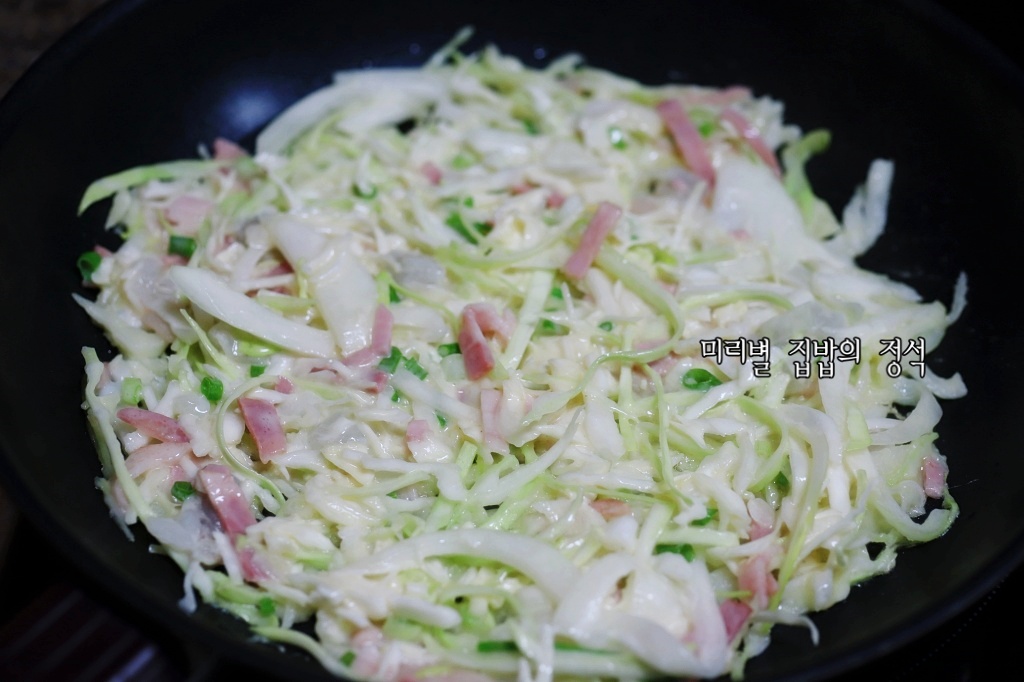 중약불로 달군 팬에 기름을 두르고 양배추반죽을 얇게 펼쳐주는데 바닥면이 노릇노릇해지면 윗부분에 기름을 뿌린 후 뒤집어 노릇노릇하게 익혀주세요~