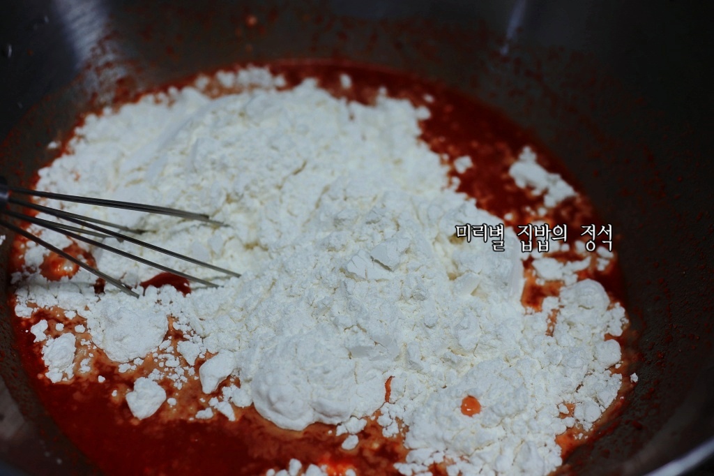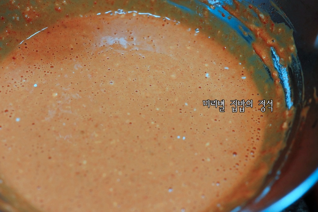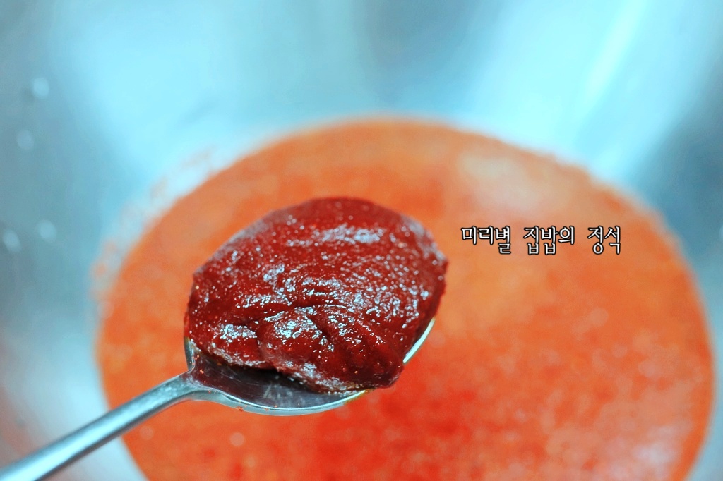 찬물 1.컵에 고춧가루 1컵, 고추장 3숟가락 넣어