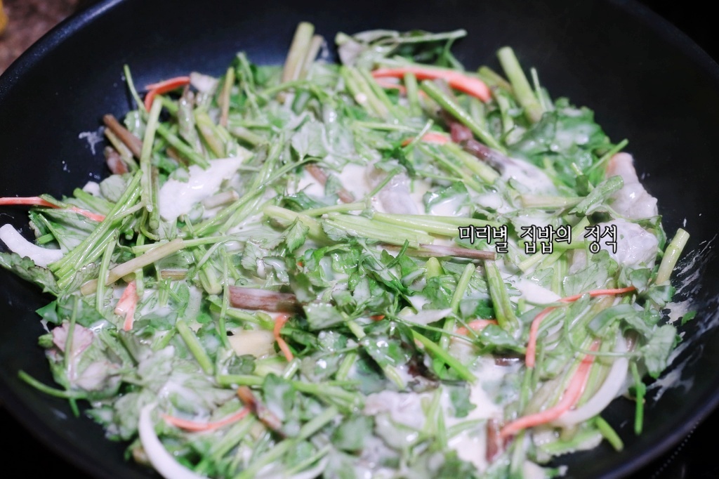 미나리에 물기가 있기 때문에 찬물은 너무 많이 넣지 마세요~