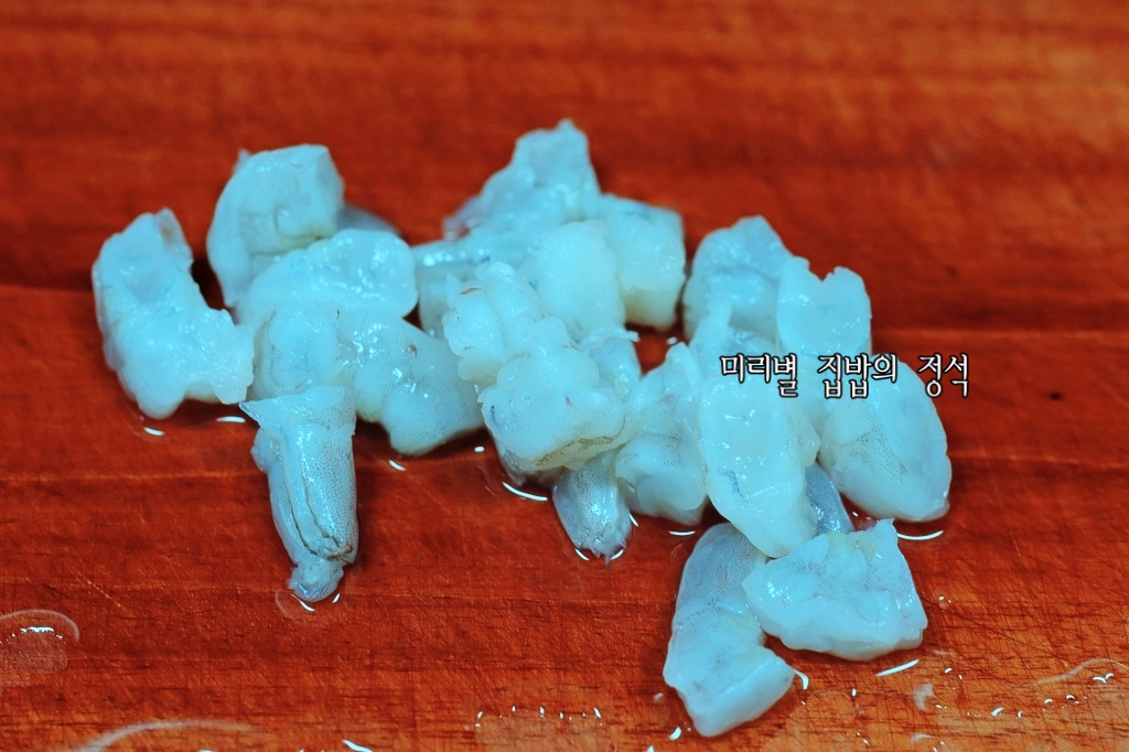 냉동새우살은 찬물에 담가 해동한 후 먹기 좋은 크기로 썰어주세요~