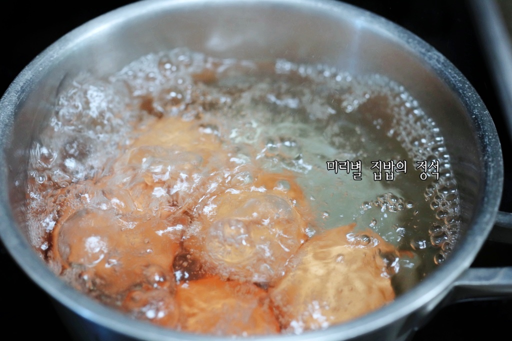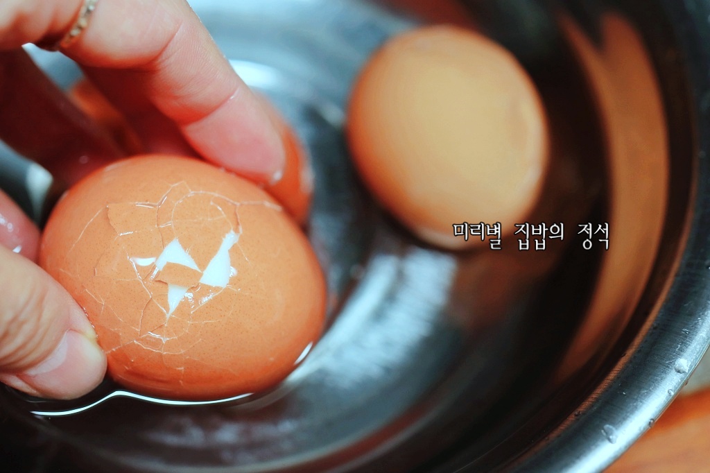 바로 찬물에 담가 여열을 식혀야 흰자와 노른자 사이에 파란색 막 황화철이 생기지 않아요~