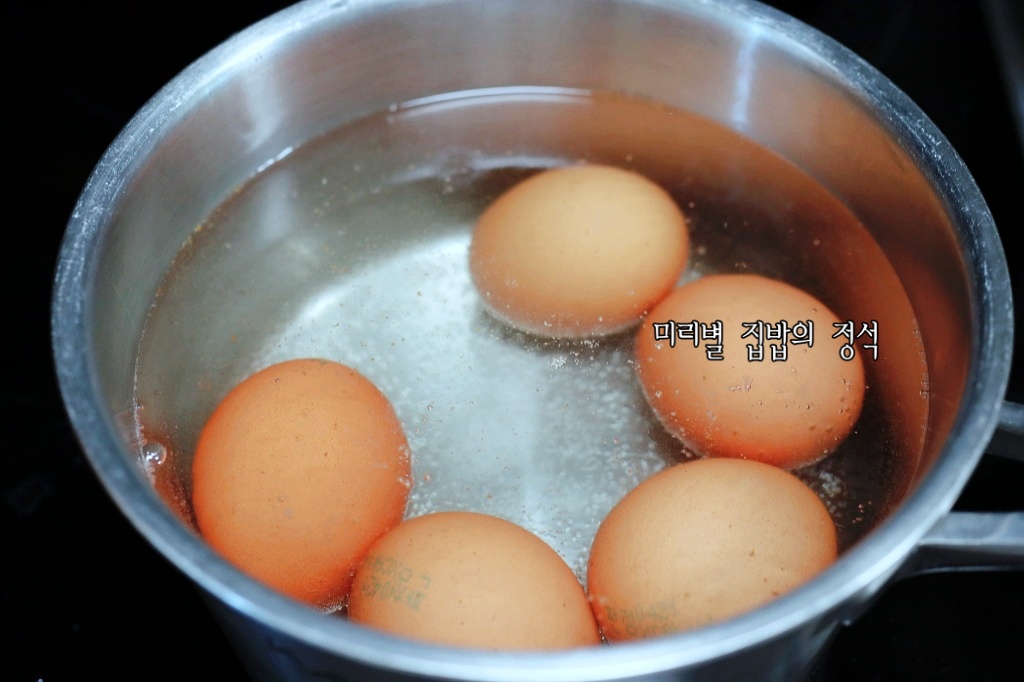 냄비에 달걀 5개, 물 1L, 굵은소금 1/2숟가락, 식초 1숟가락 넣어 센불로 끓여주세요~