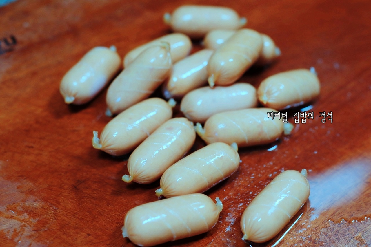 비엔나소세지는 칼집을 낸 후 따뜻한 물에 한 번 헹궈 기름기를 제거해 준 후 곁들여 주었습니다.