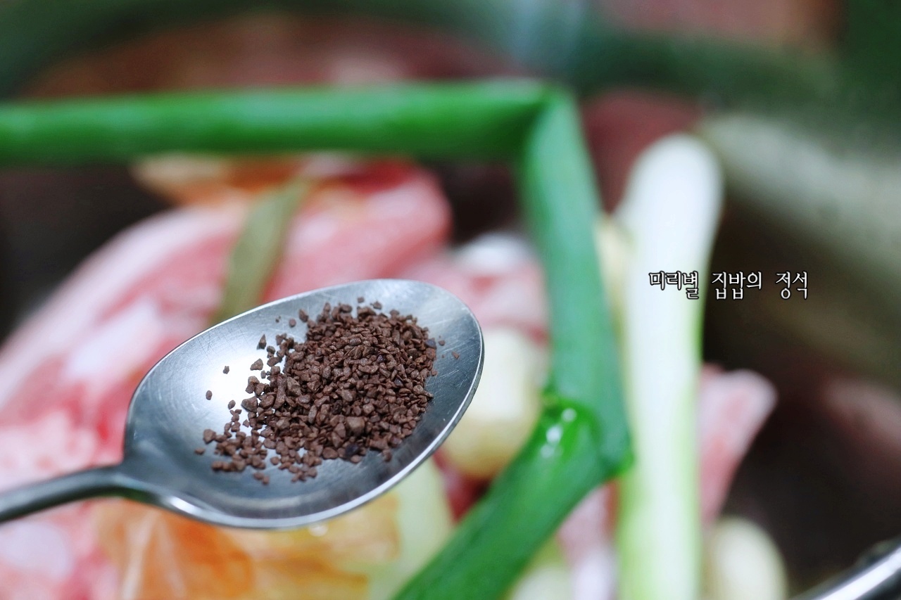 월계수잎 2장, 인스턴트 분말커피 1/3숟가락, 집된장 1숟가락 넣어주세요~