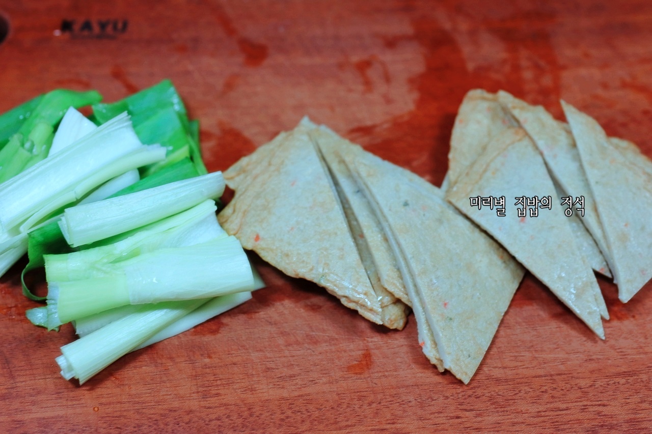 대파 1대는 길게 반 가른 후 길게 썰어주고, 어묵 3장은 먹기 좋은 삼각 모양으로 썰어주세요~
