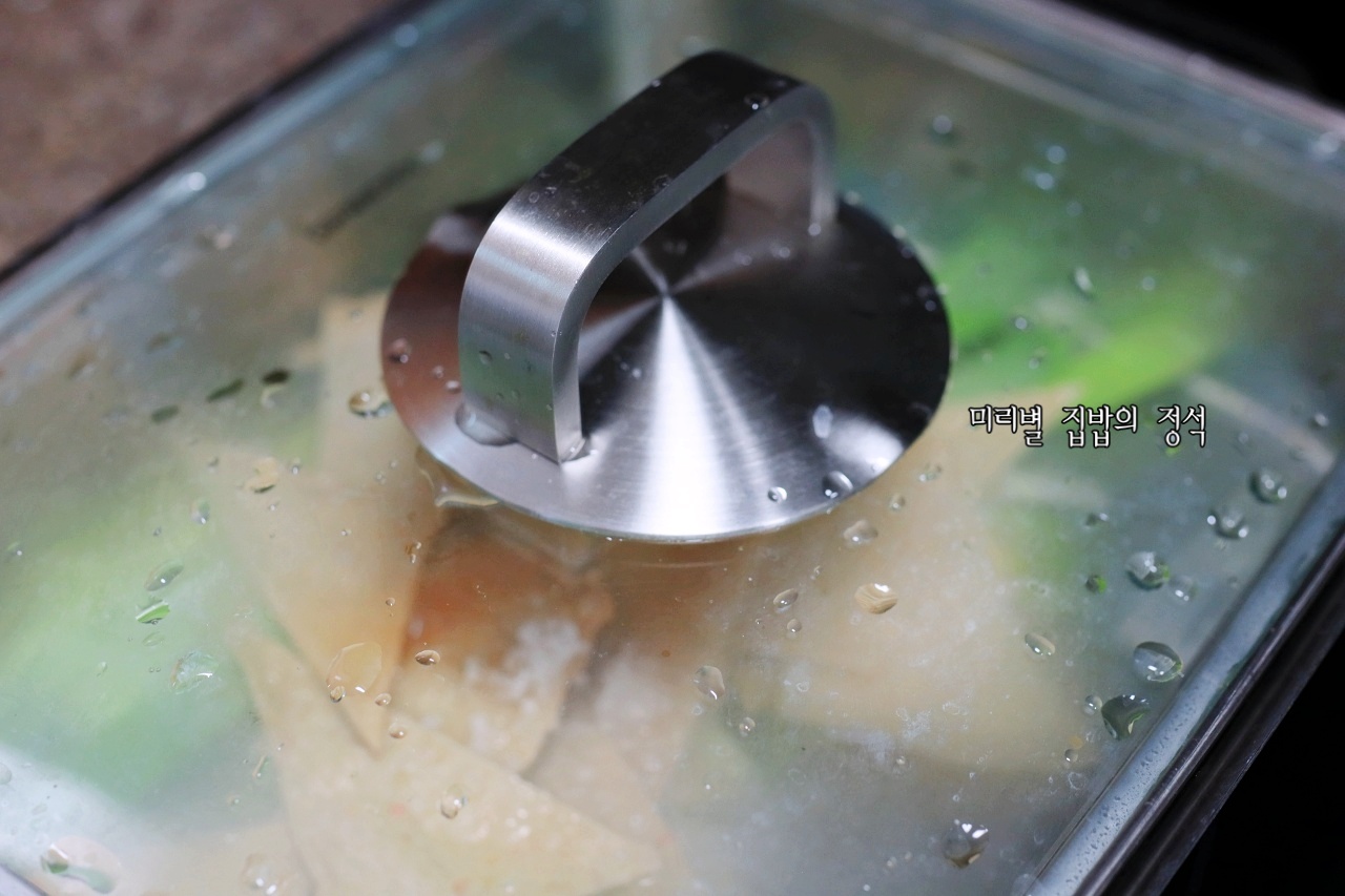 육수가 만들어졌으면 밀떡은 흐르는 물에 한 번 헹궈 냄비에 넣어주고 뚜껑 닫고 1분 ~ 2분 정도 끓여주세요~
