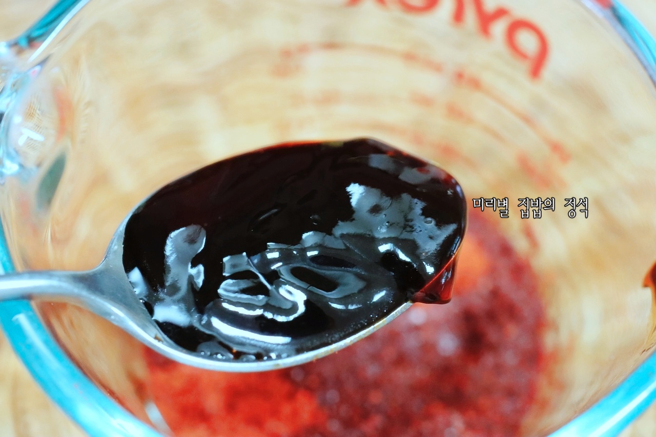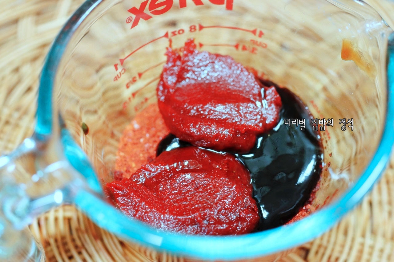 고춧가루 4숟가락, 설탕 3숟가락, 양조간장 2숟가락, 굴소스 2숟가락, 고추장 2숟가락 듬뿍, 식용유 1숟가락, 후추 20바퀴 갈갈(혹은 후추가루 1t)넣어 잘 섞어 주세요~