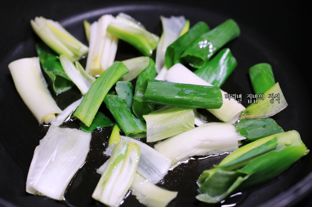 중강불로 달군 팬에 기름 6숟가락, 대파를 넣어 볶은 후 뚜껑을 덮어 기름에 튀기듯이 파기름을 만들어 주는데