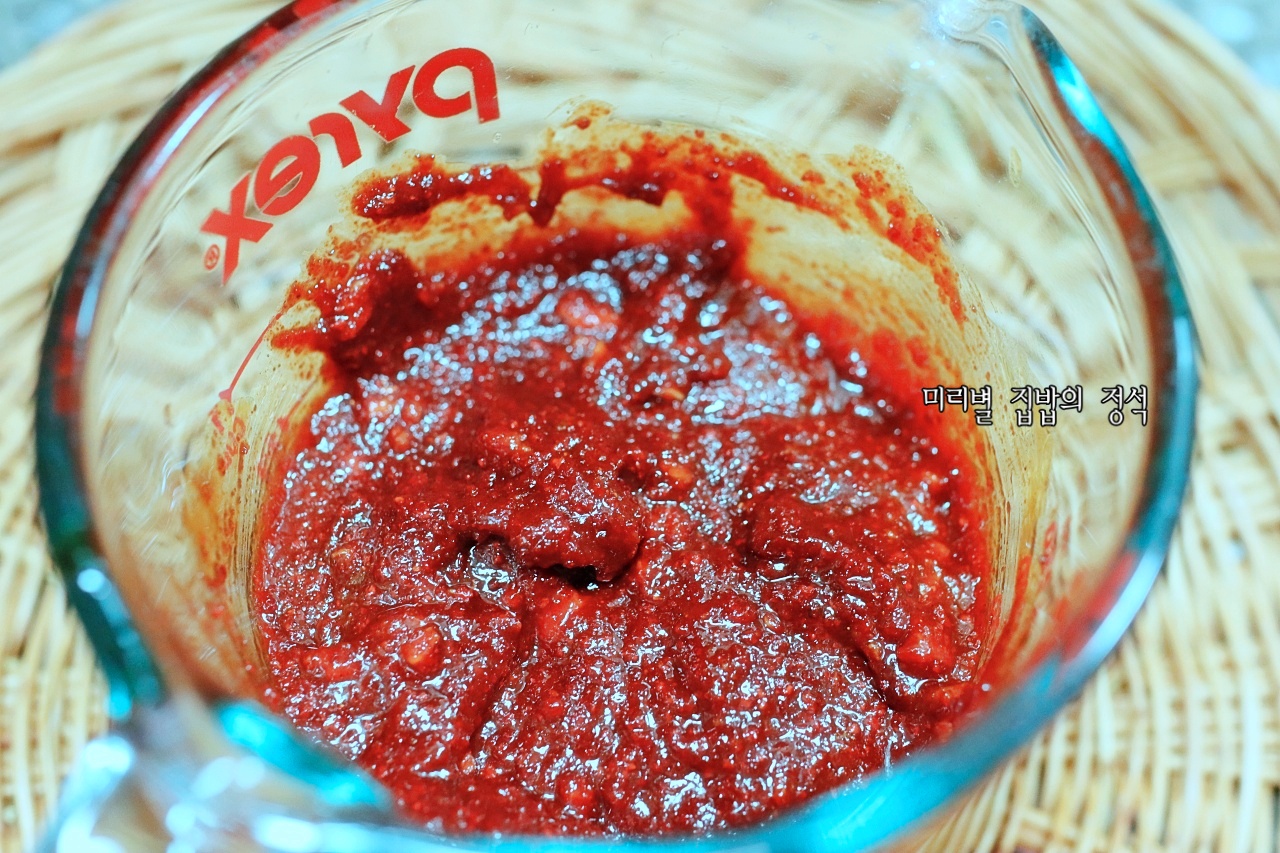 굵은 고춧가루 2.5숟가락, 고운 고춧가루 2숟가락, 고추장 3숟가락 듬뿍, 양조간장 2숟가락, 굴소스 1숟가락,