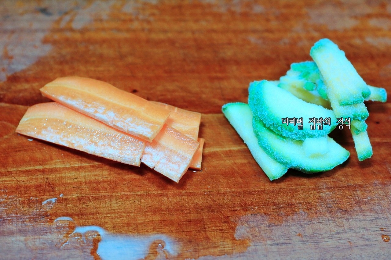 당근은 굵게 썰어주고, 애호박은 반달썰기해 줍니다.