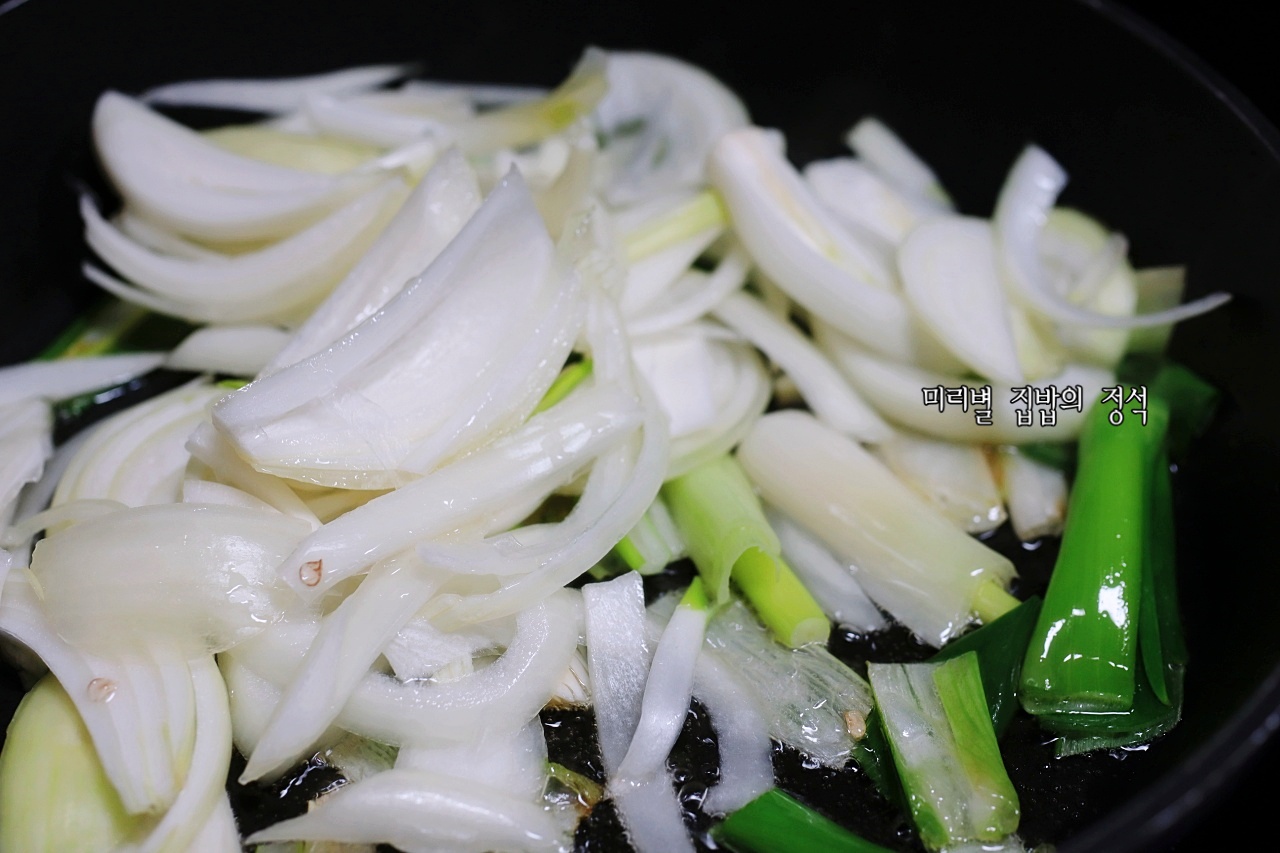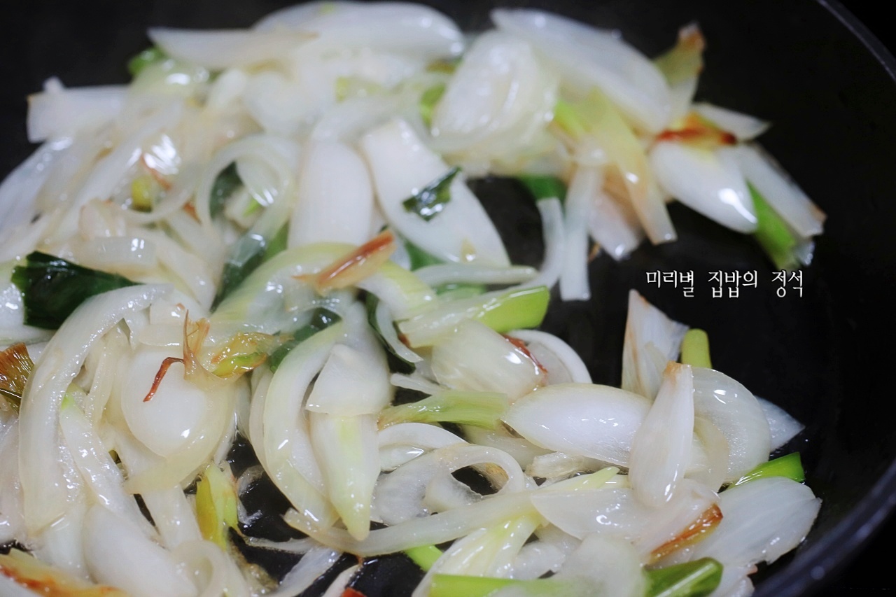 파기름이 충분히 만들어졌으면 채썬 양파를 넣어 볶다가 뚜껑 덮어 양파를 기름에 튀기듯이 노릇노릇하게 볶아주는데