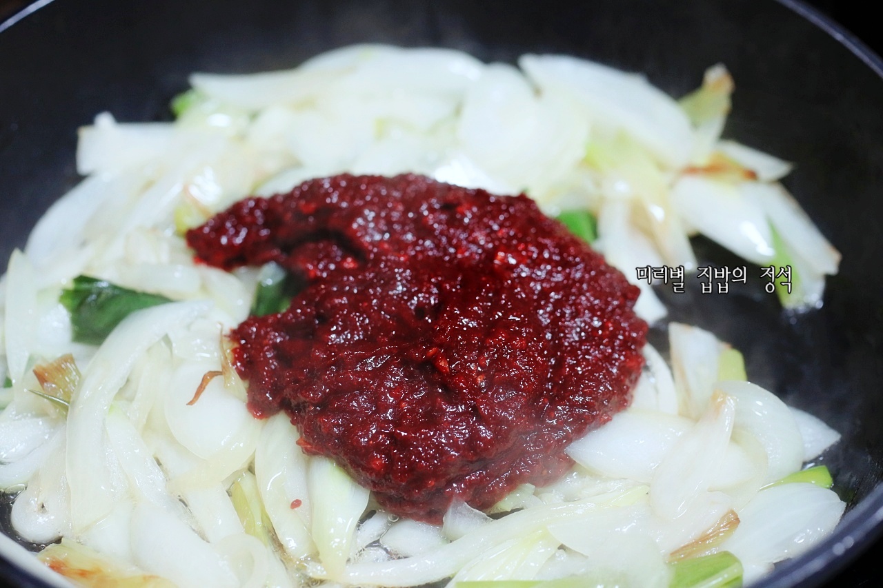 양파가 노릇노릇해지면 쭈꾸미볶음양념을 넣어 중불로 한 번 볶아주고