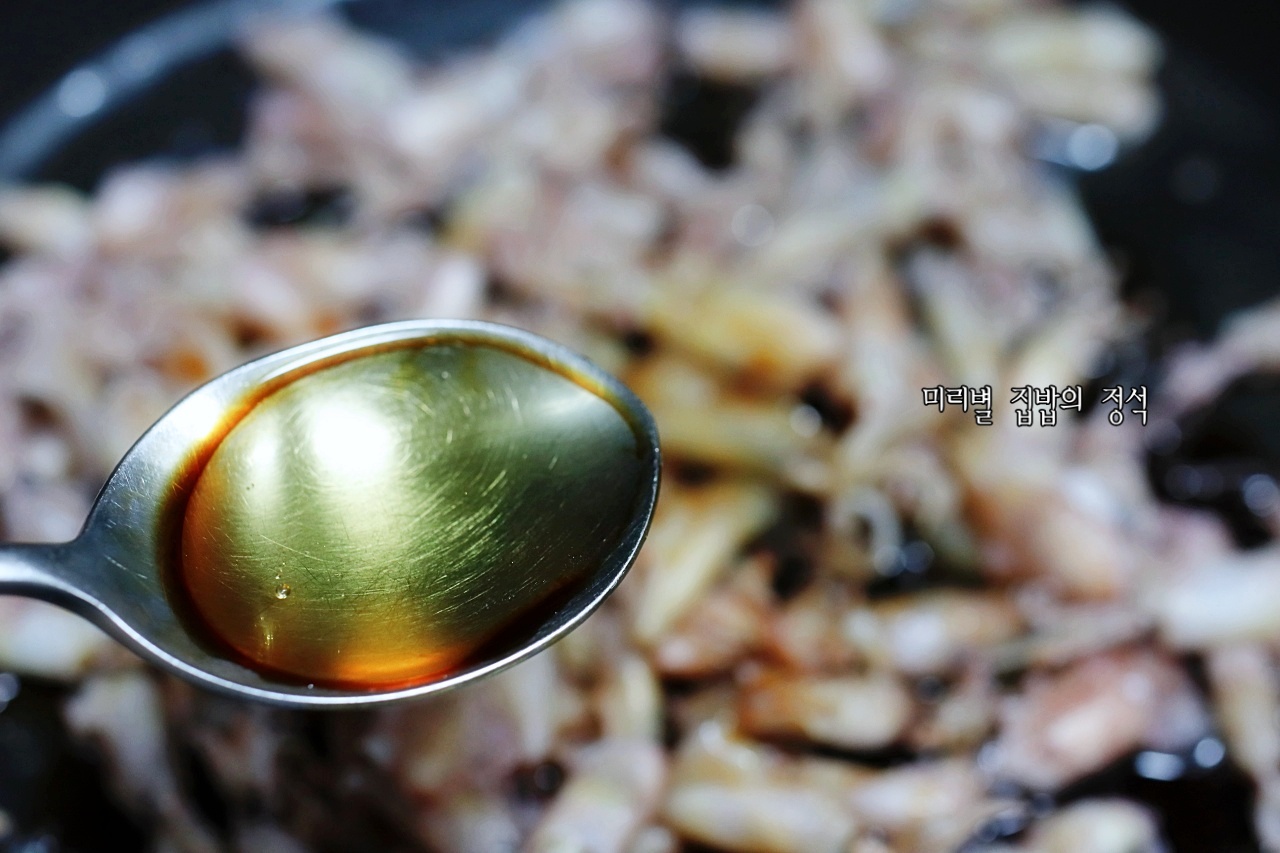 양조간장 3숟가락, 설탕 1/3숟가락, 맛술 1숟가락, 올리고당 1/2숟가락을 넣어 중불로 볶아 조려줍니다.