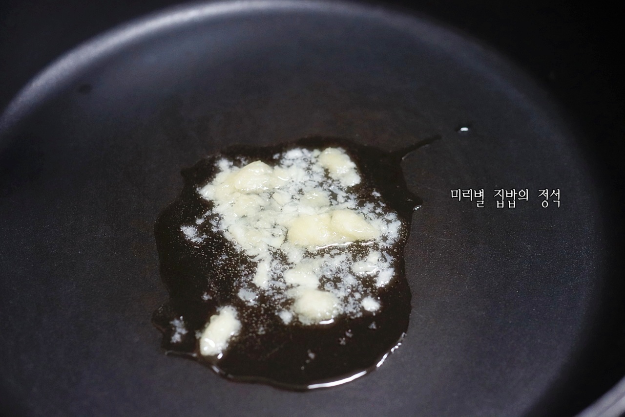 중강불로 달군 팬에 기름 1숟가락, 다진마늘 1/2숟가락 넣어 마늘향이 나도록 중강불로 볶아줍니다.