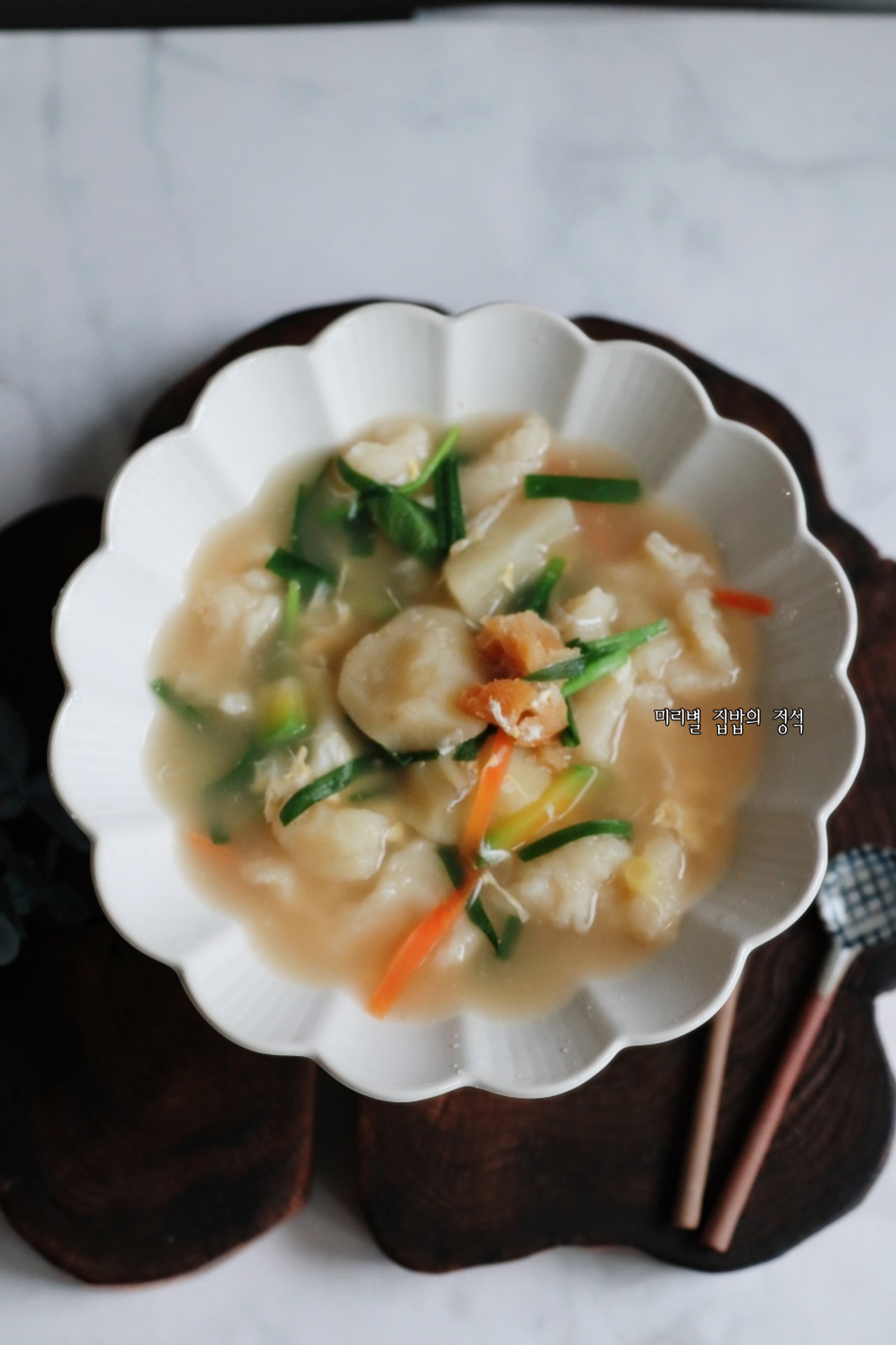 수제비반죽할 때 찰지게 만들기 위해 감자전분과 식용유 1숟가락 넣어 반죽을 했더니 쫀득한 식감이 매력적이었습니다~ 감자와 황태를 들기름에 달달 볶아주고 멸치다시마육수를 진하게 끓여 넣었더니 국물이 아주 끝내주는 맛이었습니다.