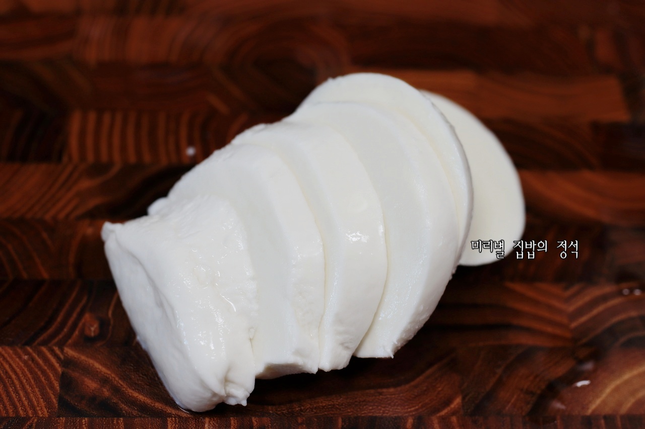 생모짜렐라치즈는 토마토 두께와 비슷하게 슬라이스한 후 키친타올을 이용해 물기를 살짝 제거해 줍니다.