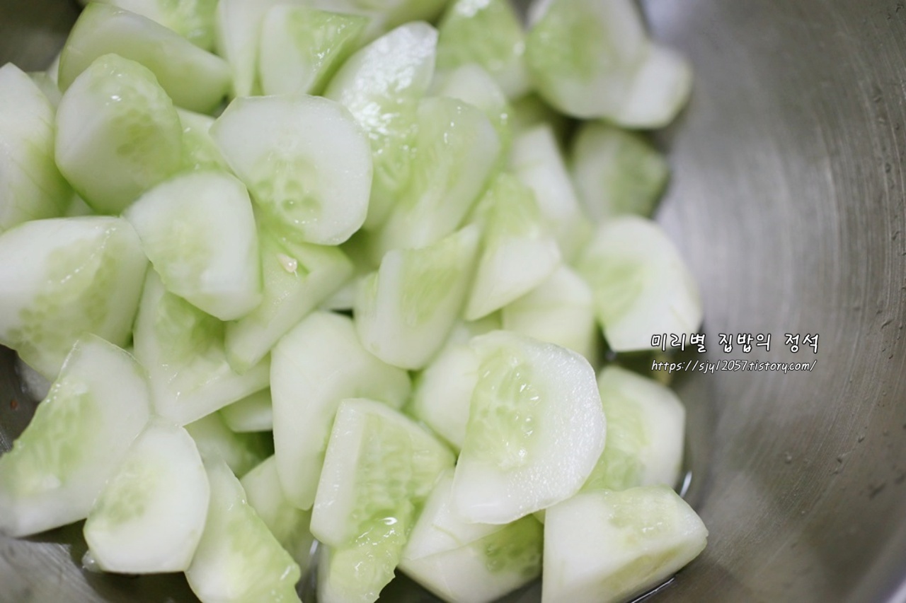 오이를 얇게 썰어도 되지만 전 투박하게 썰어서 먹는 게 식감이 더 좋아 투박하게 썰었습니다