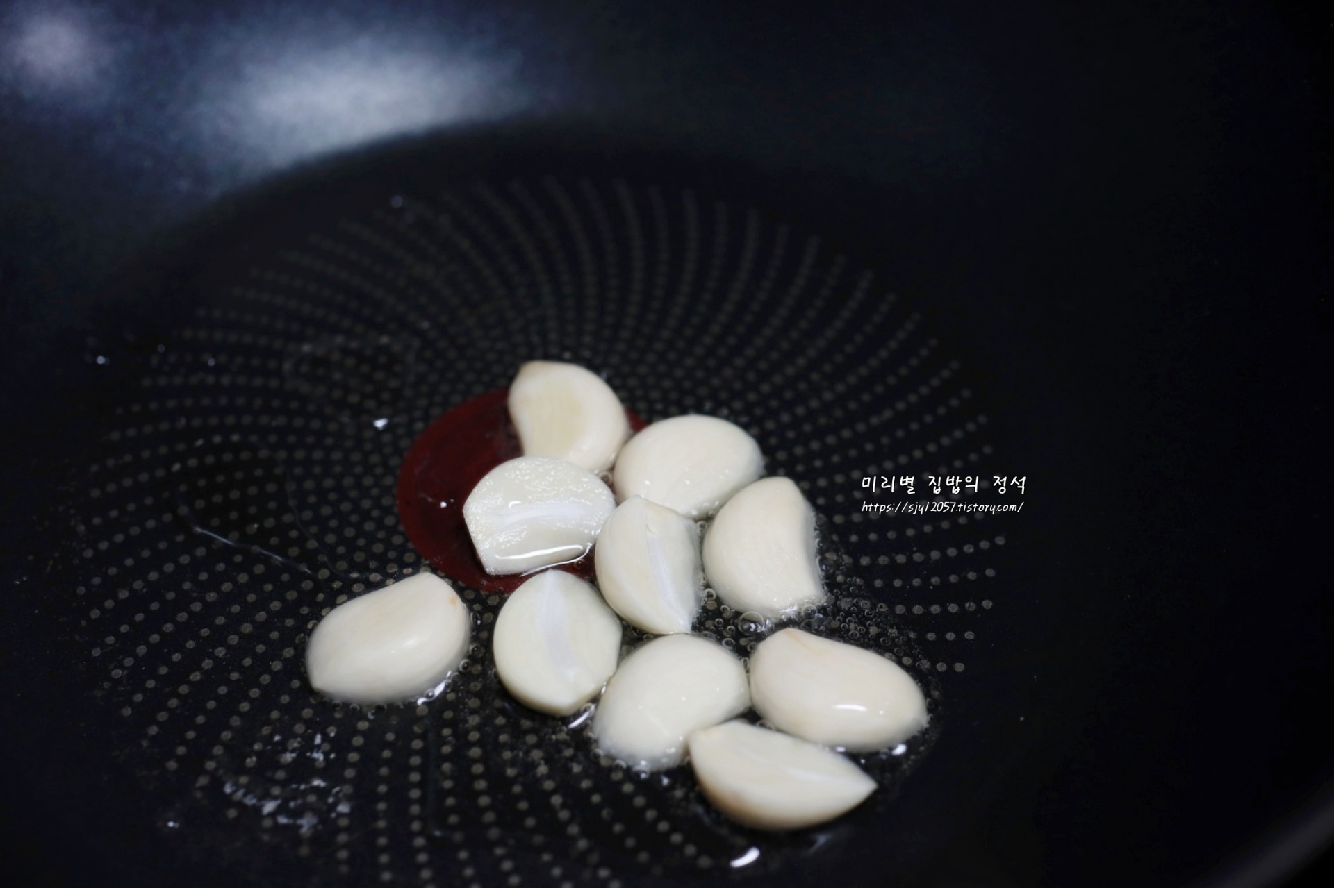 중불로 달군 팬에 기름 1숟가락 두르고 편마늘을 넣어 마늘향이 나도록 볶아주고
