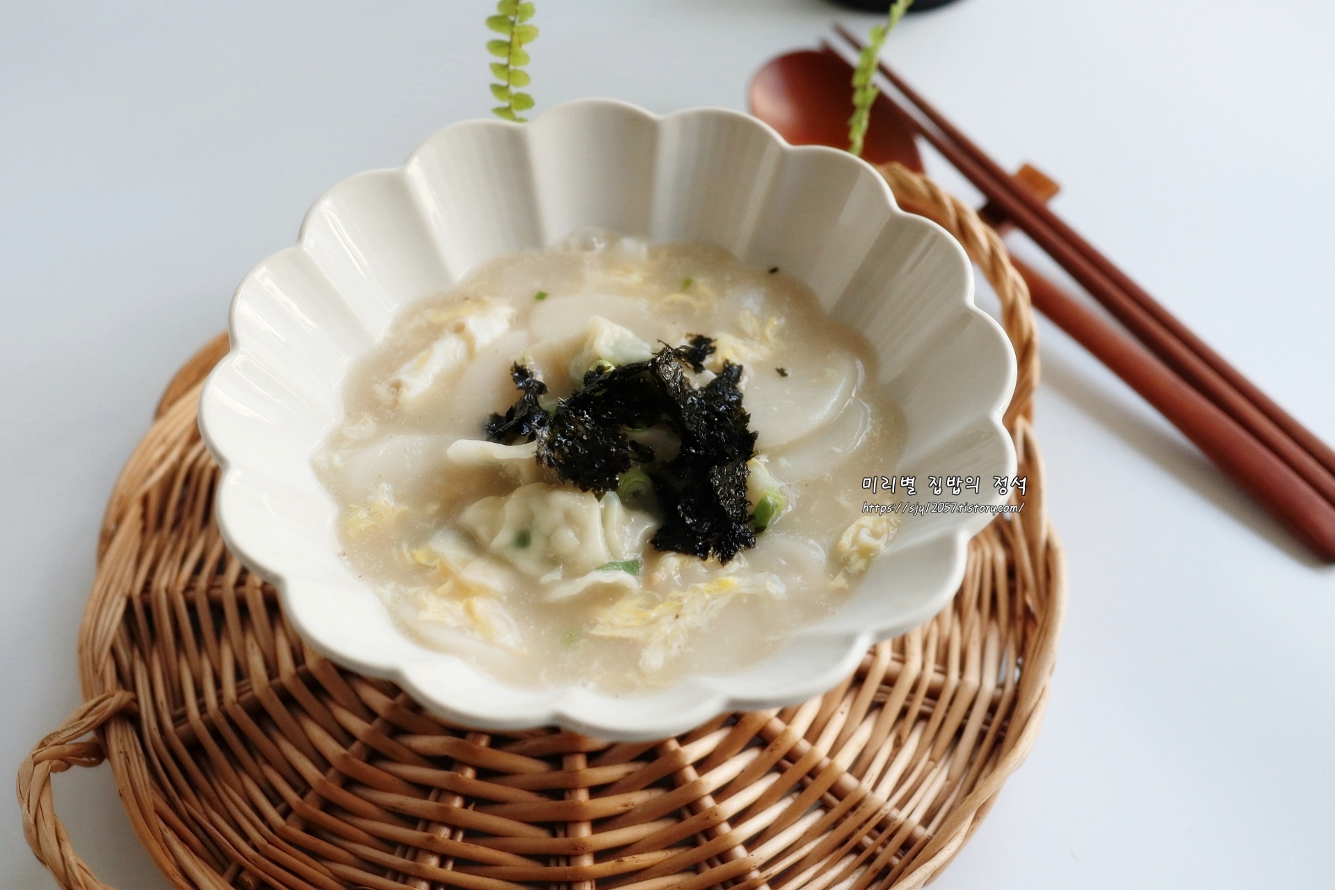 물만두 사다 놓은 게 있어서 물만두를 넣어 떡만두국 황금레시피로 끓였더니