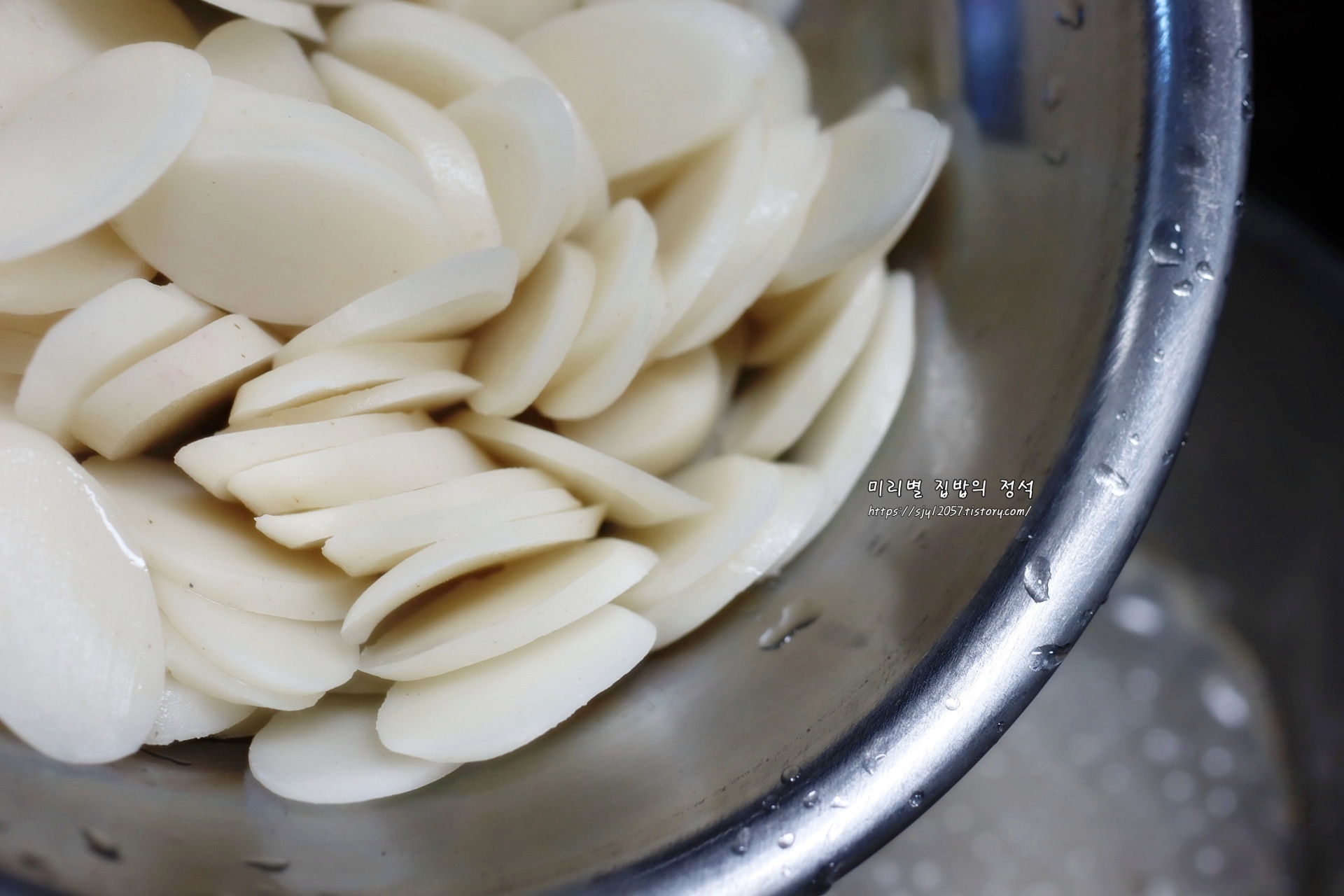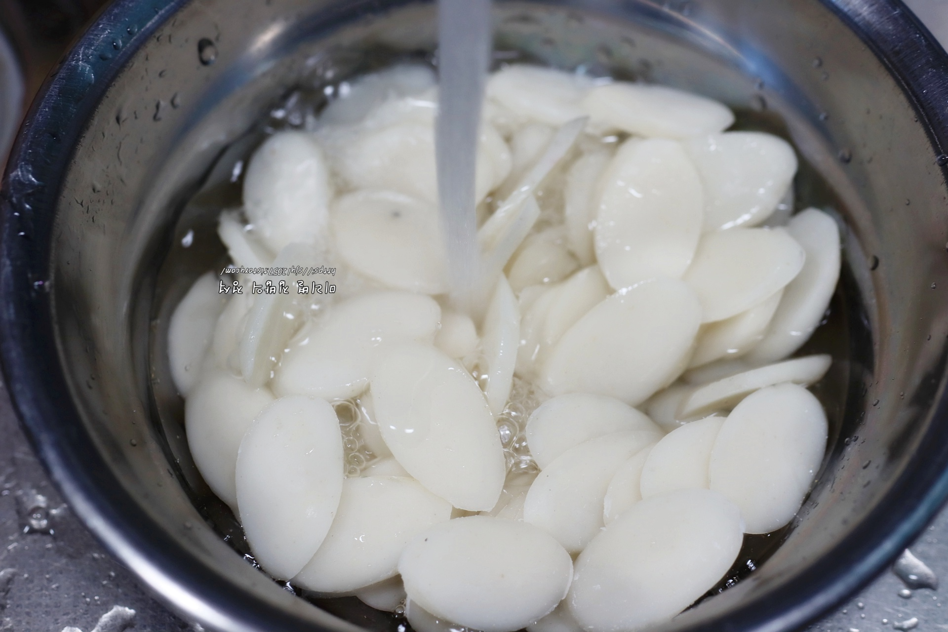떡국떡은 흐르는 물에 헹궈 체망에 담아 물기를 빼 주세요.