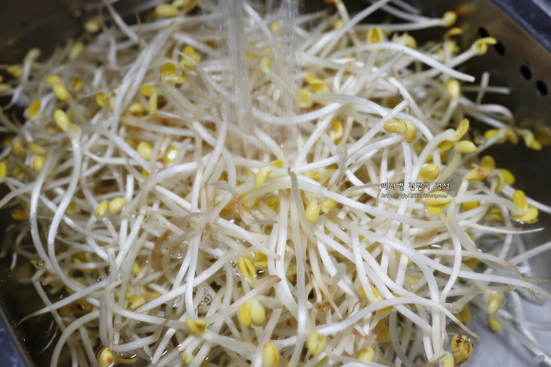 콩나물은 흐르는 물에 두세 번 정도 씻어 콩껍질 등 제거 후 채망에 담아 물기를 빼 줍니다.