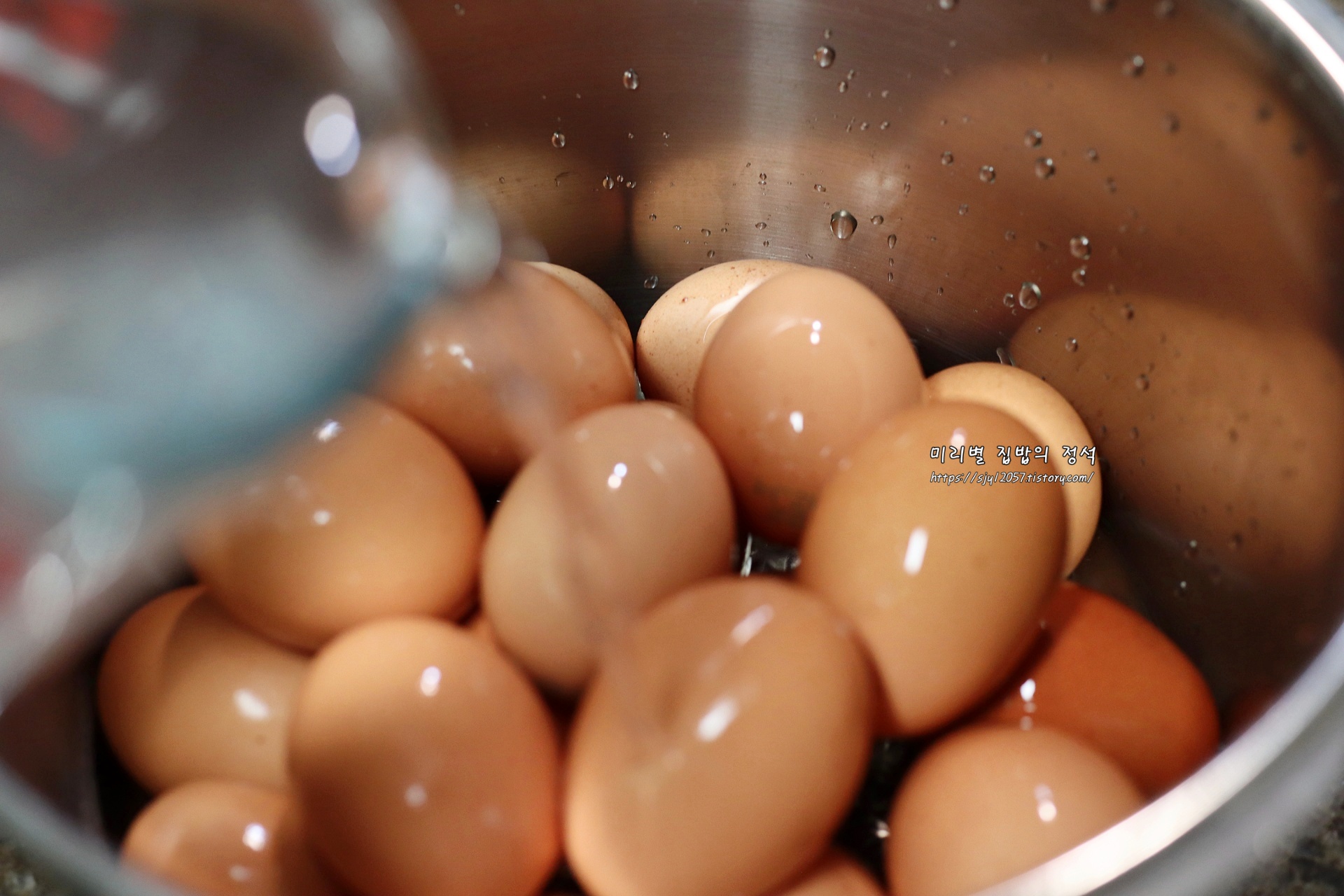 흐르는 물에 씻어 계란껍질에 묻어 있는 이물질을 제거해 줍니다.