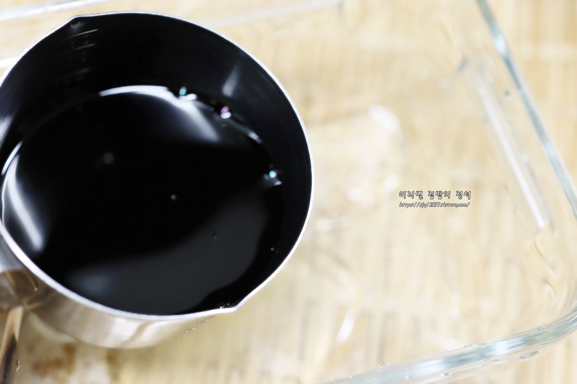 밀폐용기에 정수물 150ml, 양조간장 150ml, 설탕 2숟가락, 올리고당 2숟가락, 다진마늘 1숟가락을 넣어