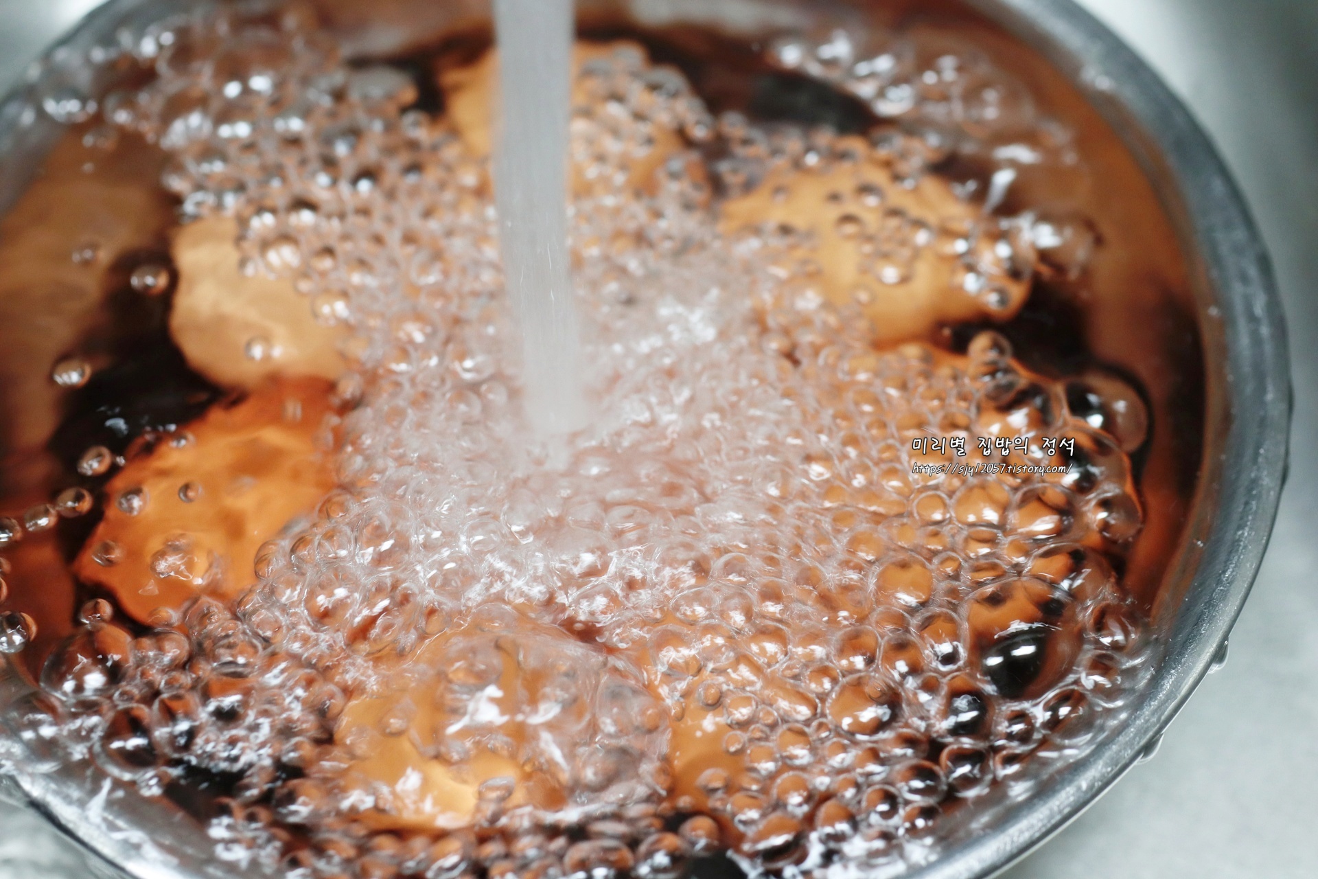 삶은 후에는 바로 찬물에 헹궈 여열을 충분히 식혀 줍니다.