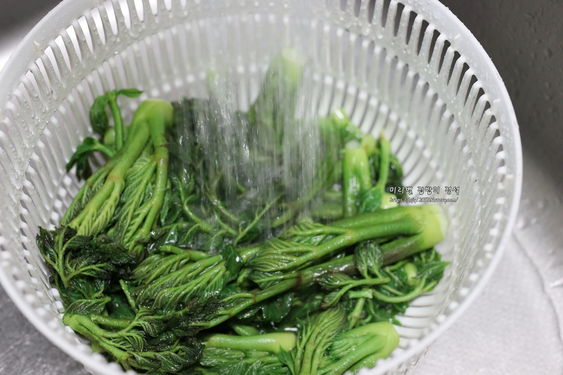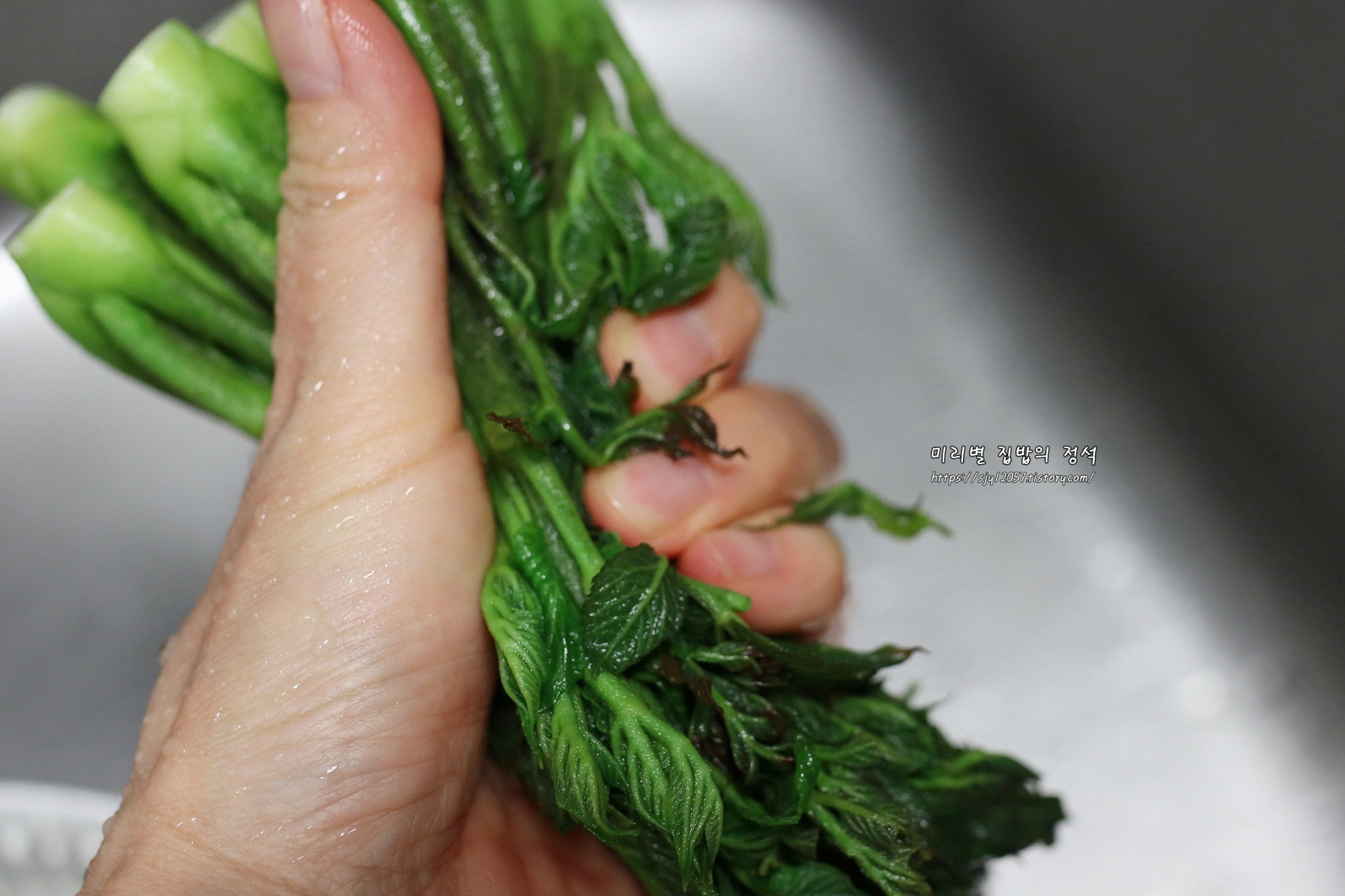흐르는 물에 두릅을 씻어 불순물을 제거한 후 체망에 담아 물기를 빼줍니다.
