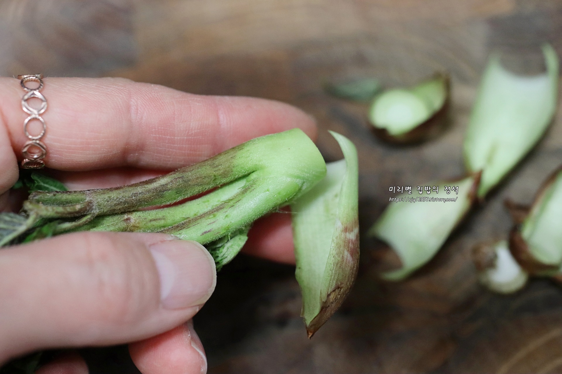 두릅가시가 있는 단단한 밑동 부분은 칼로 잘라낸 후 겉껍질을 벗겨내줍니다.