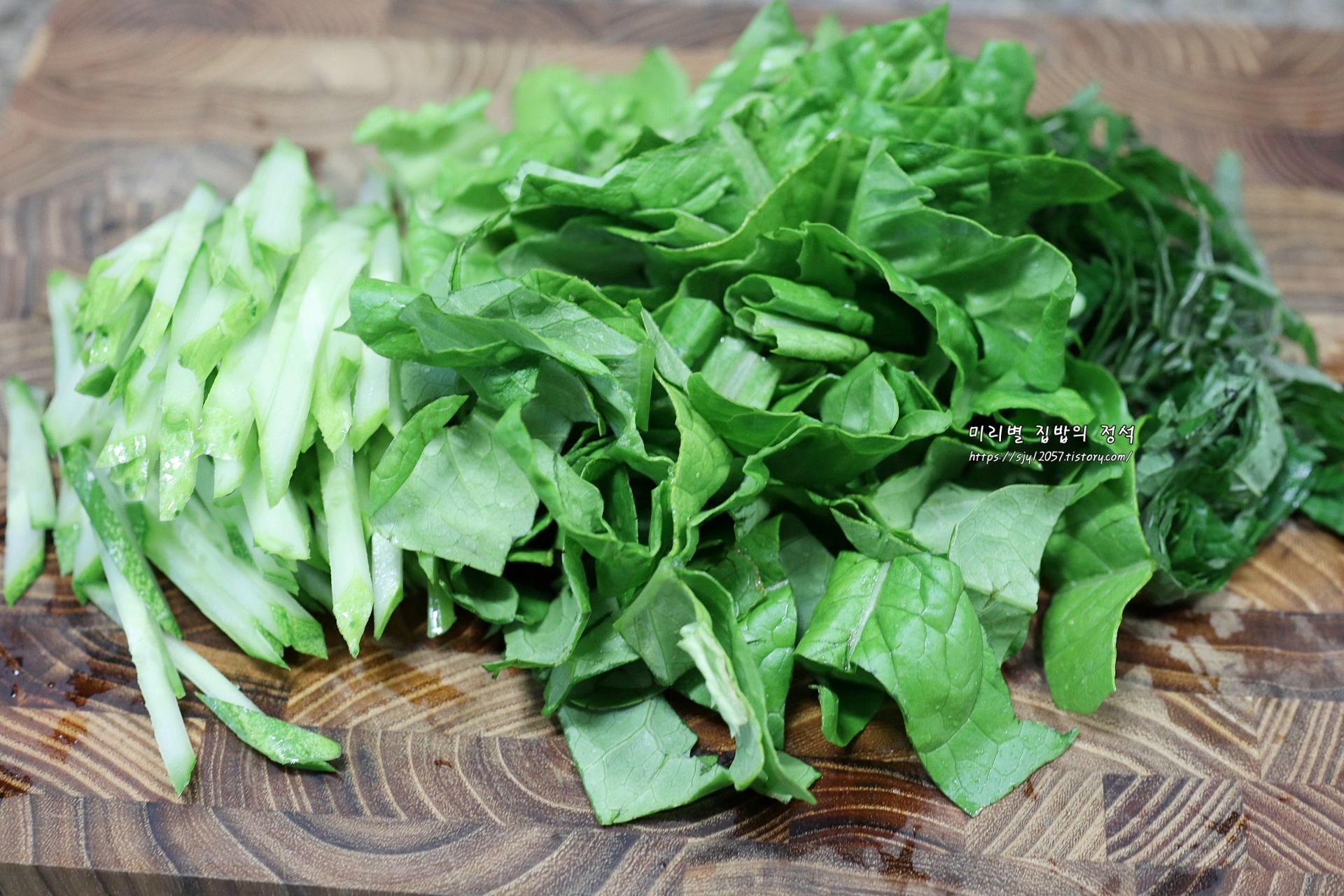 상추와 깻잎은 흐르는 물에 꼼꼼하게 씻어 물기를 탁탁 털어 겹쳐서 굵게 채썰어 줍니다.