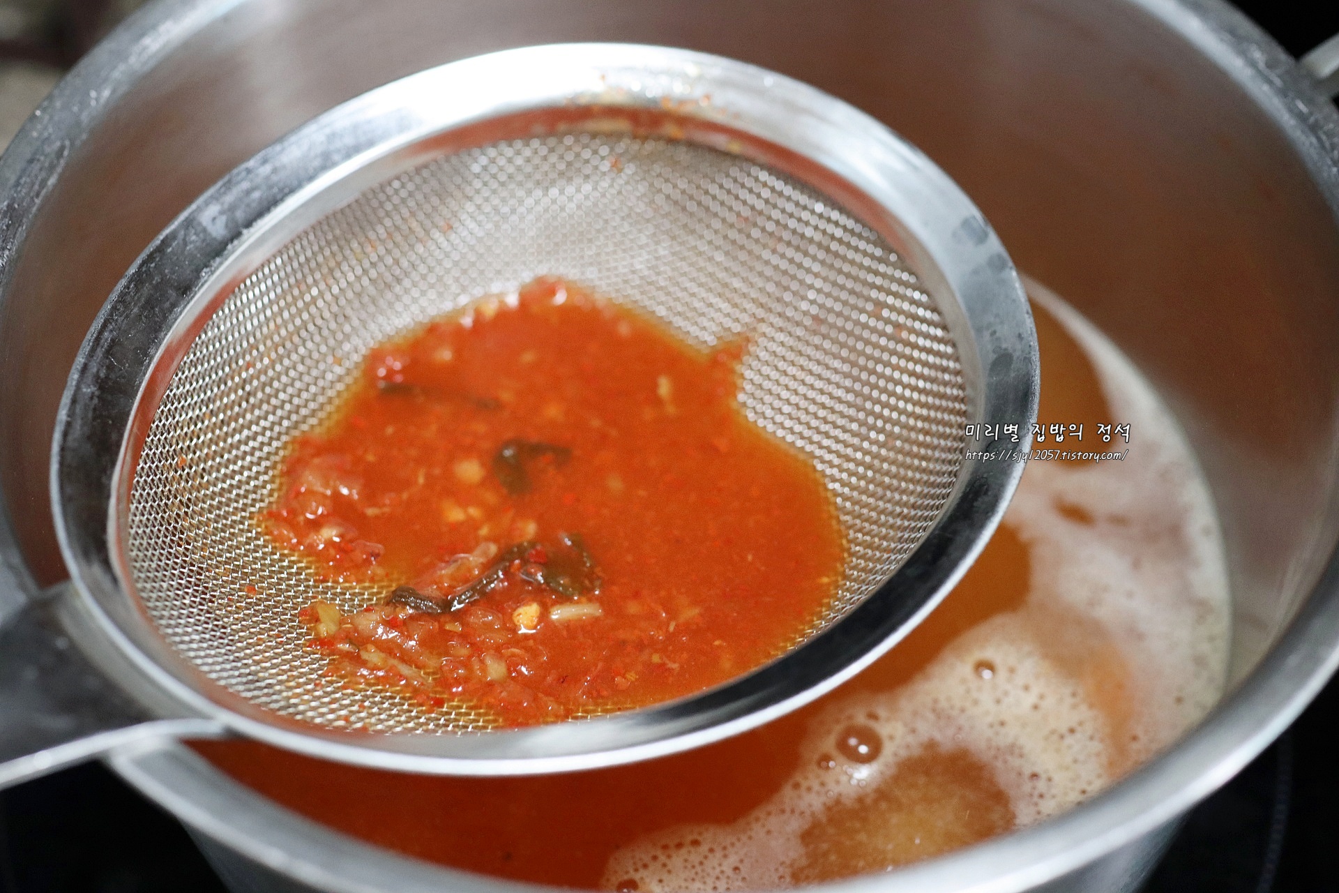 김치국물 1/2컵은 걸러서 넣어 끓여줍니다.