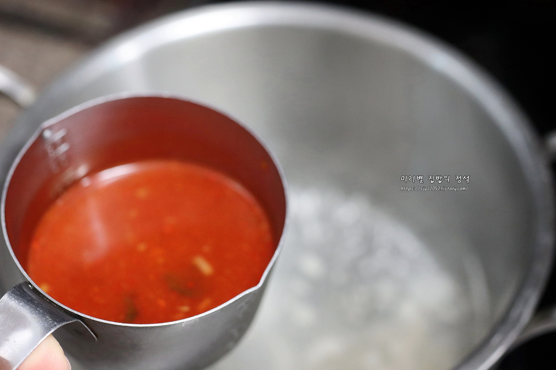 고춧가루 1/2숟가락, 고추장 1/2숟가락 넣어 잘 풀어줍니다.