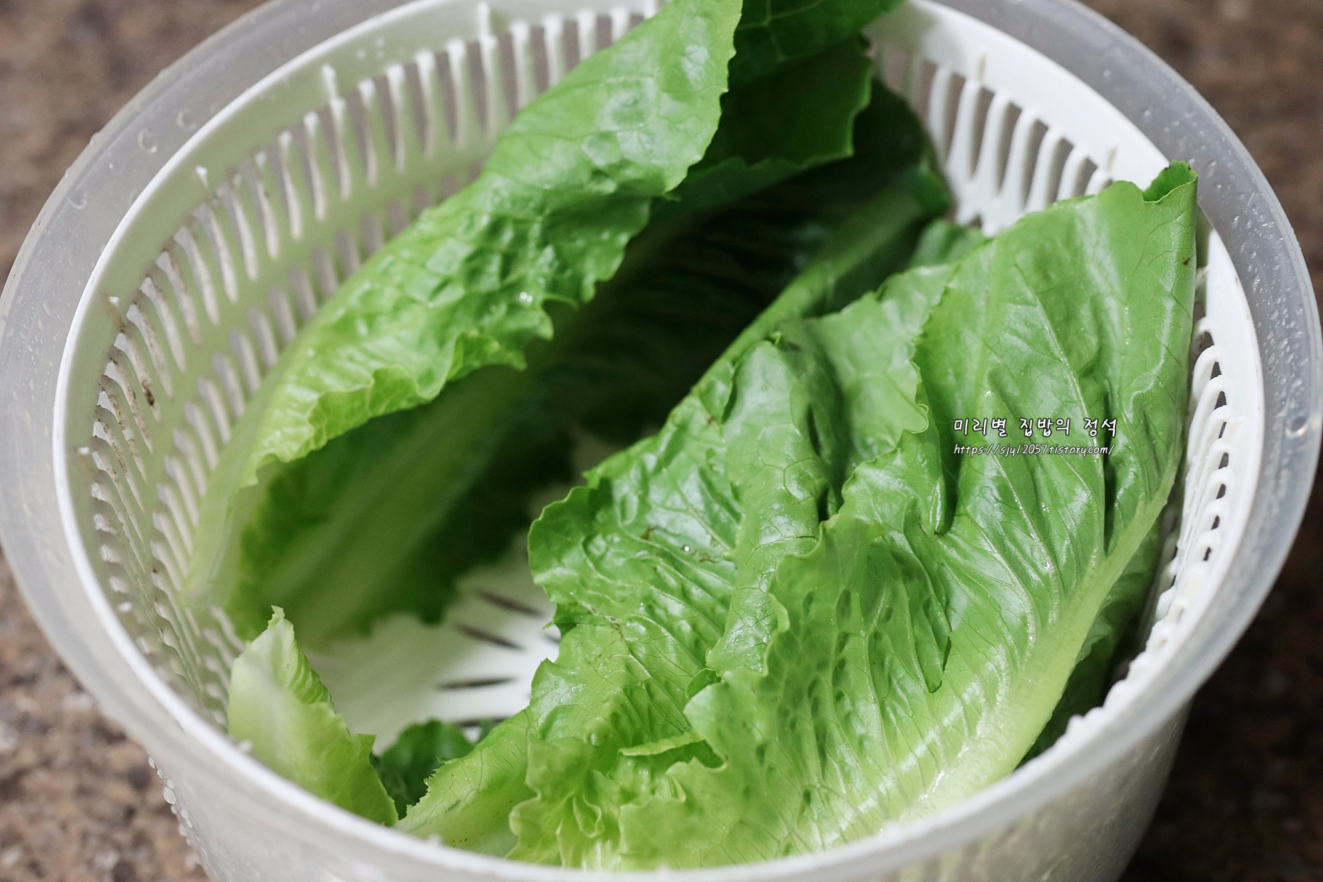 로메인상추는 흐르는 물에 씻어 야채탈수기에 넣어 물기를 최대한 제거해 줍니다.