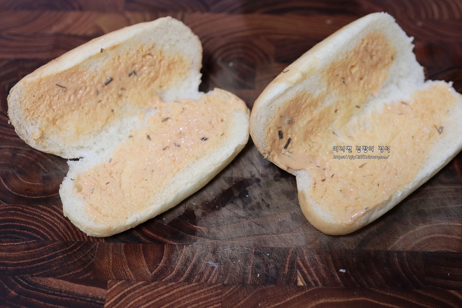 핫도그번 안쪽에 버거소스나 마요네즈를 얇게 발라줍니다.
