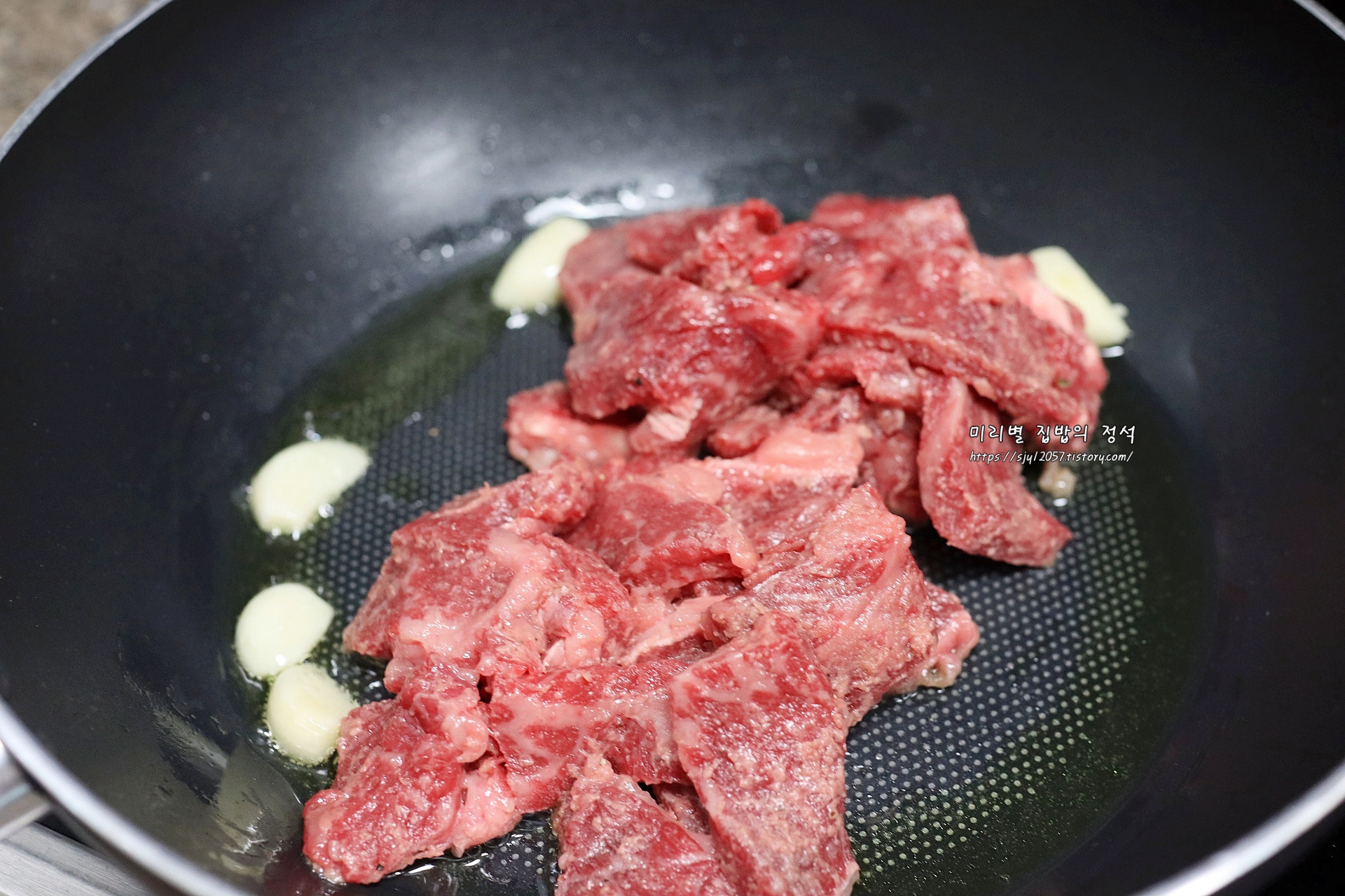 고기를 넣어 겉이 살짝 익을 정도로 중강불로 익혀줍니다.