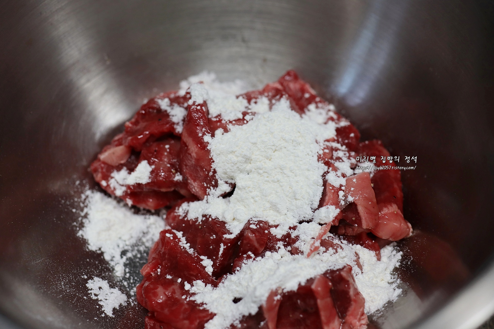 밑간한 고기에 밀가루 1숟가락 넣어 조물조물 버무려주고