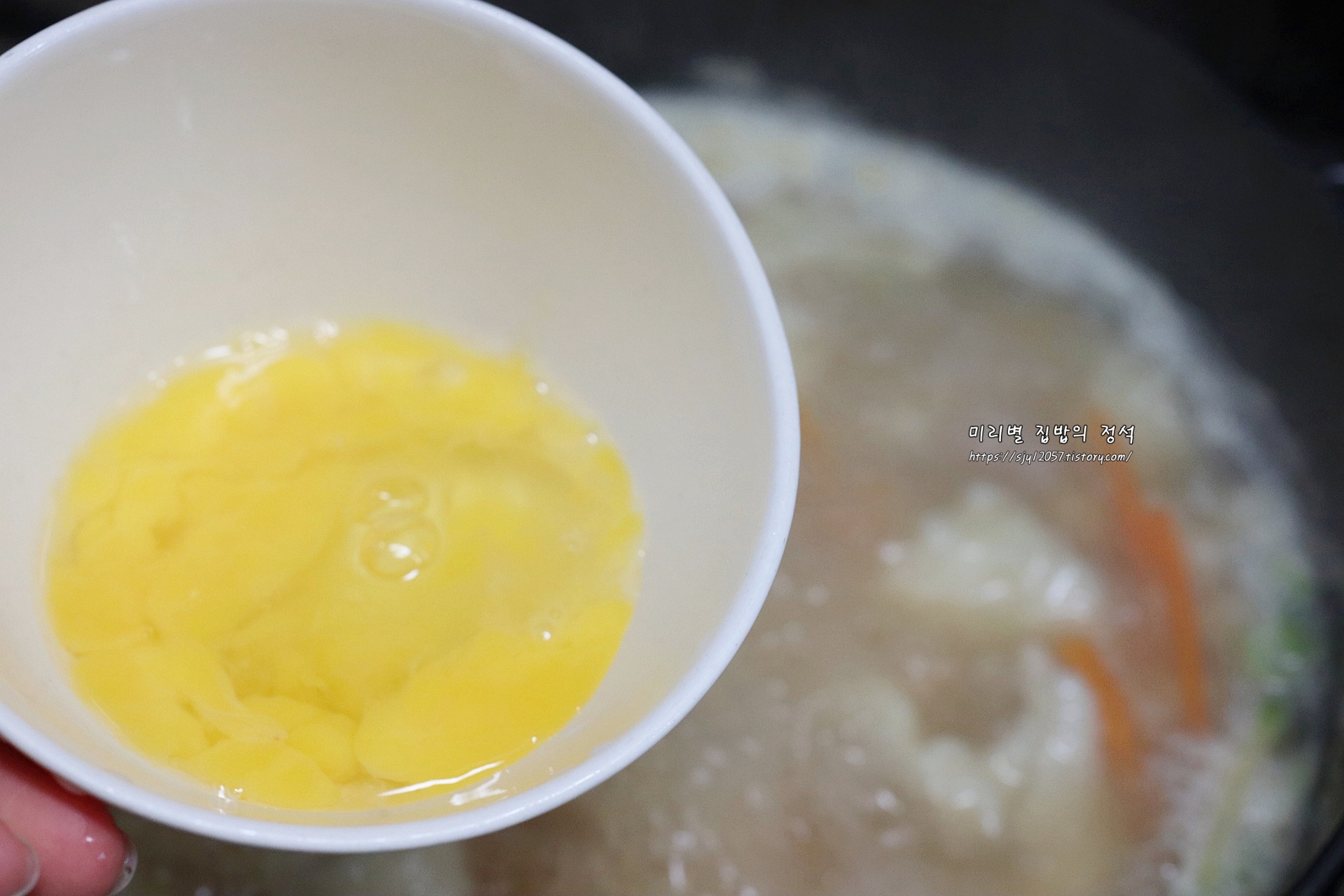 계란 1개는 깨서 알끈 제거 후 잘 섞어 육수 위에 빙 둘러 넣어줍니다~
