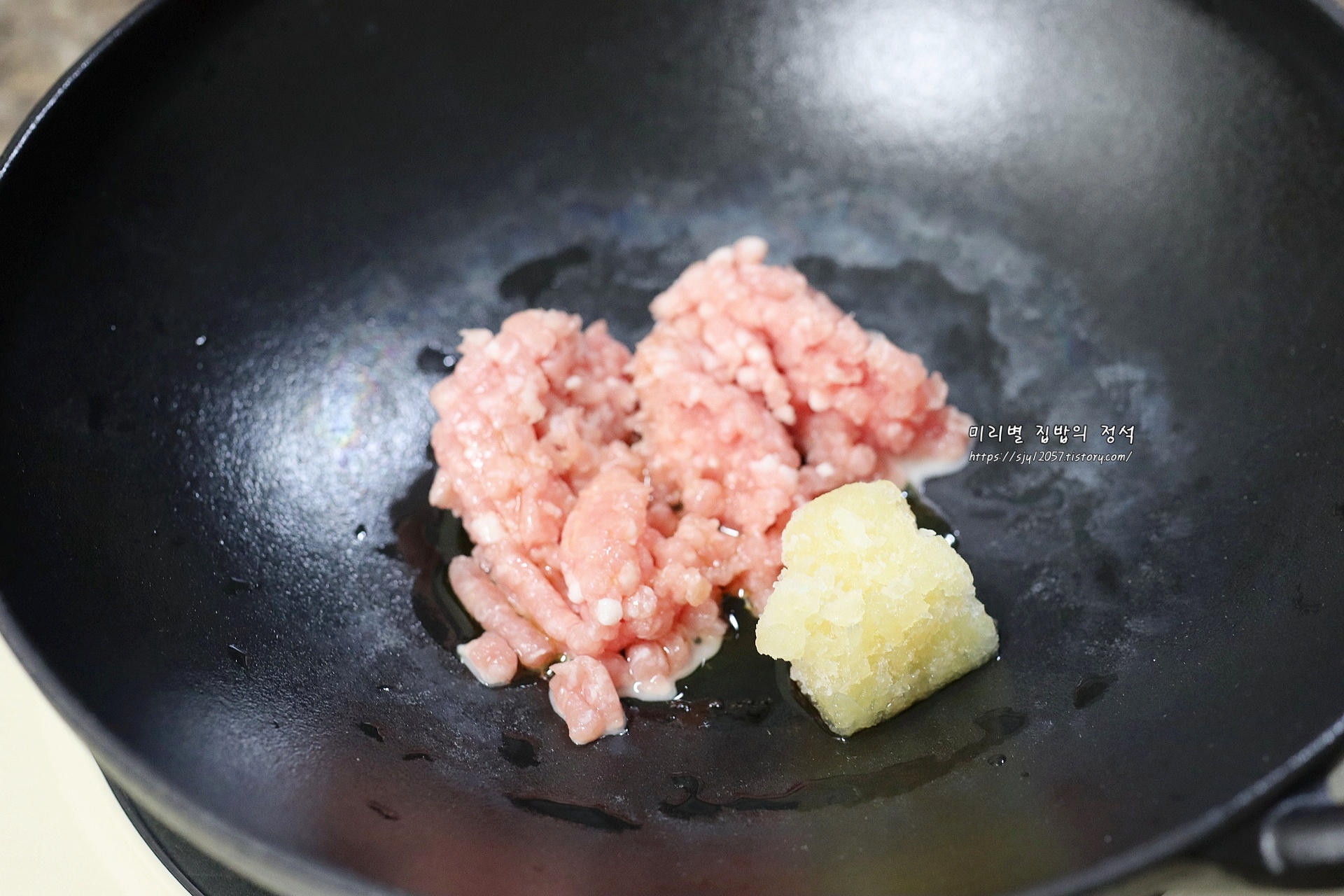 돼지고기 다짐육을 먼저 넣어 겉면이 익을 정도로 볶아줍니다.