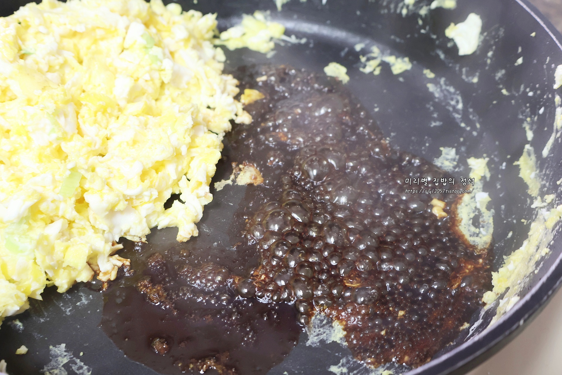팬 한쪽으로 재료를 몰아 빈 공간에 양조간장 1숟가락을 넣어 바글바글 끓여 재료와 골고루 섞어줍니다.