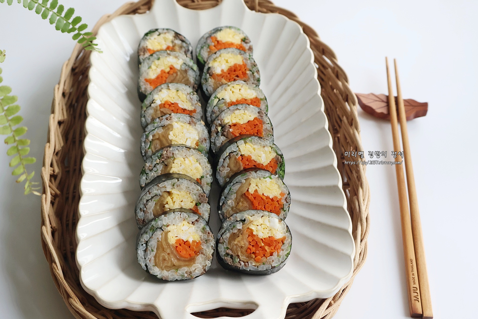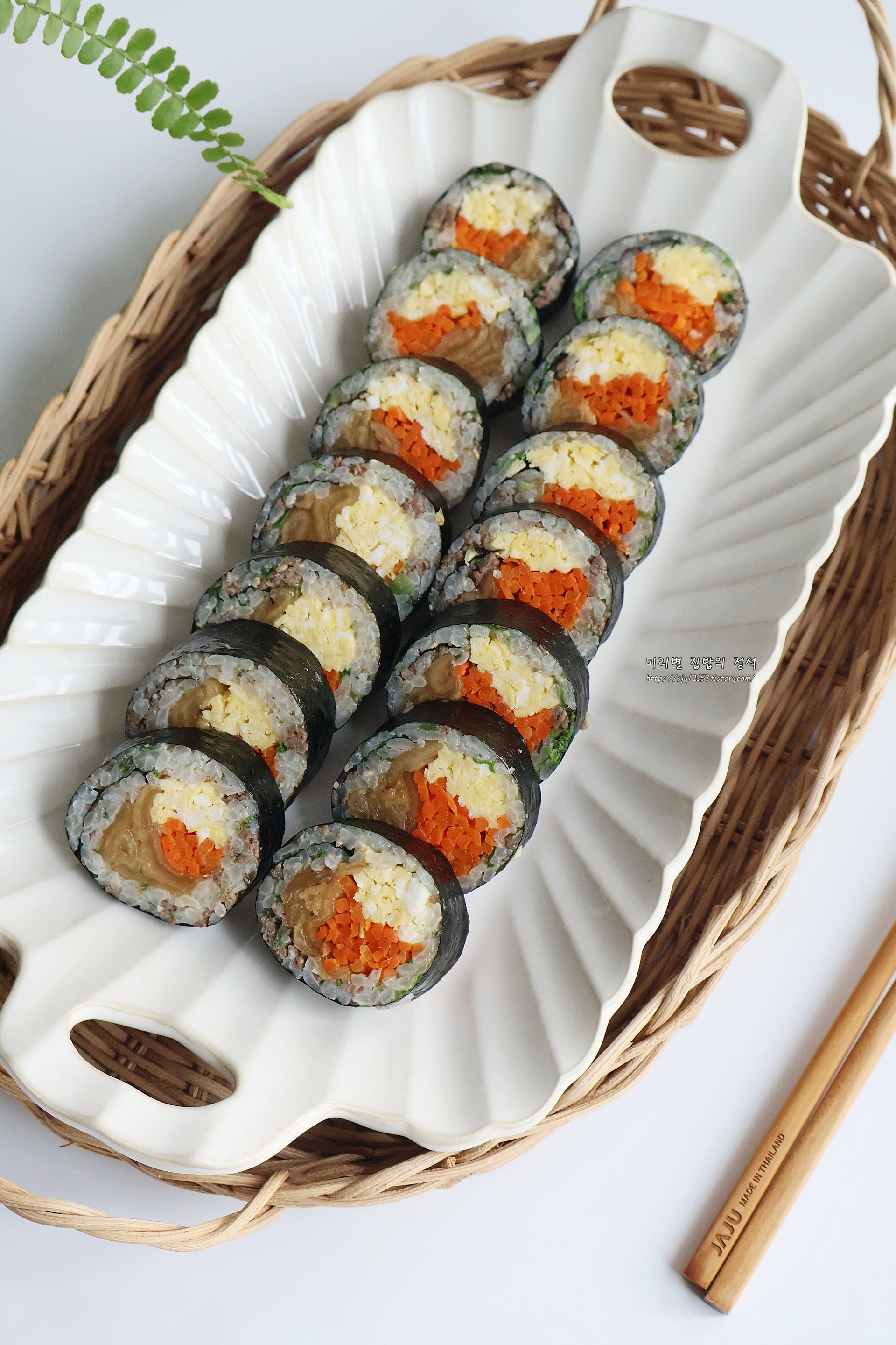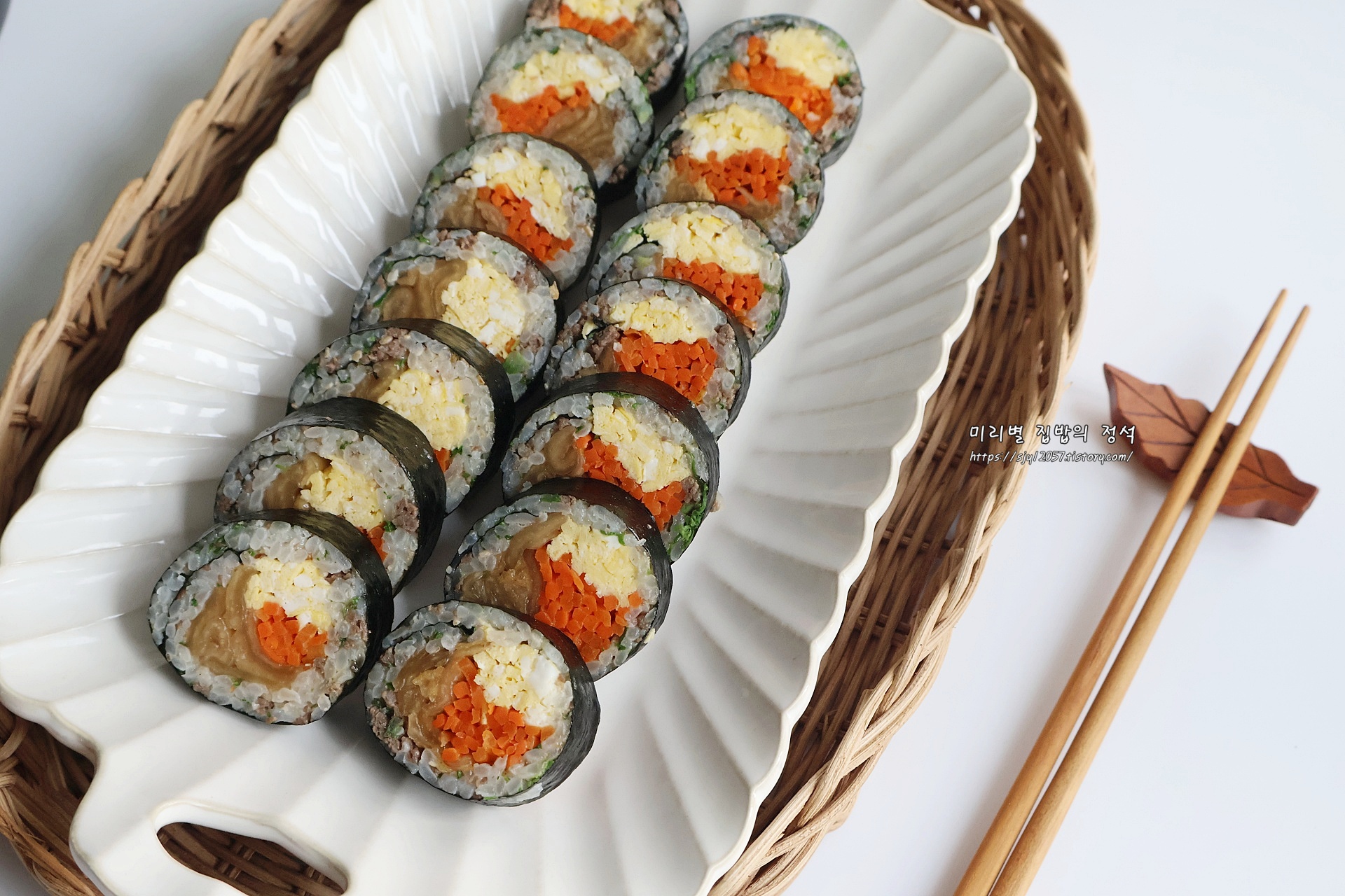 마지막 이음새는 아래로 두어 밥의 온기로 김이 자연스럽게 붙게 하고, 먹기 좋은 크기로 썰어주면 완성입니다.
