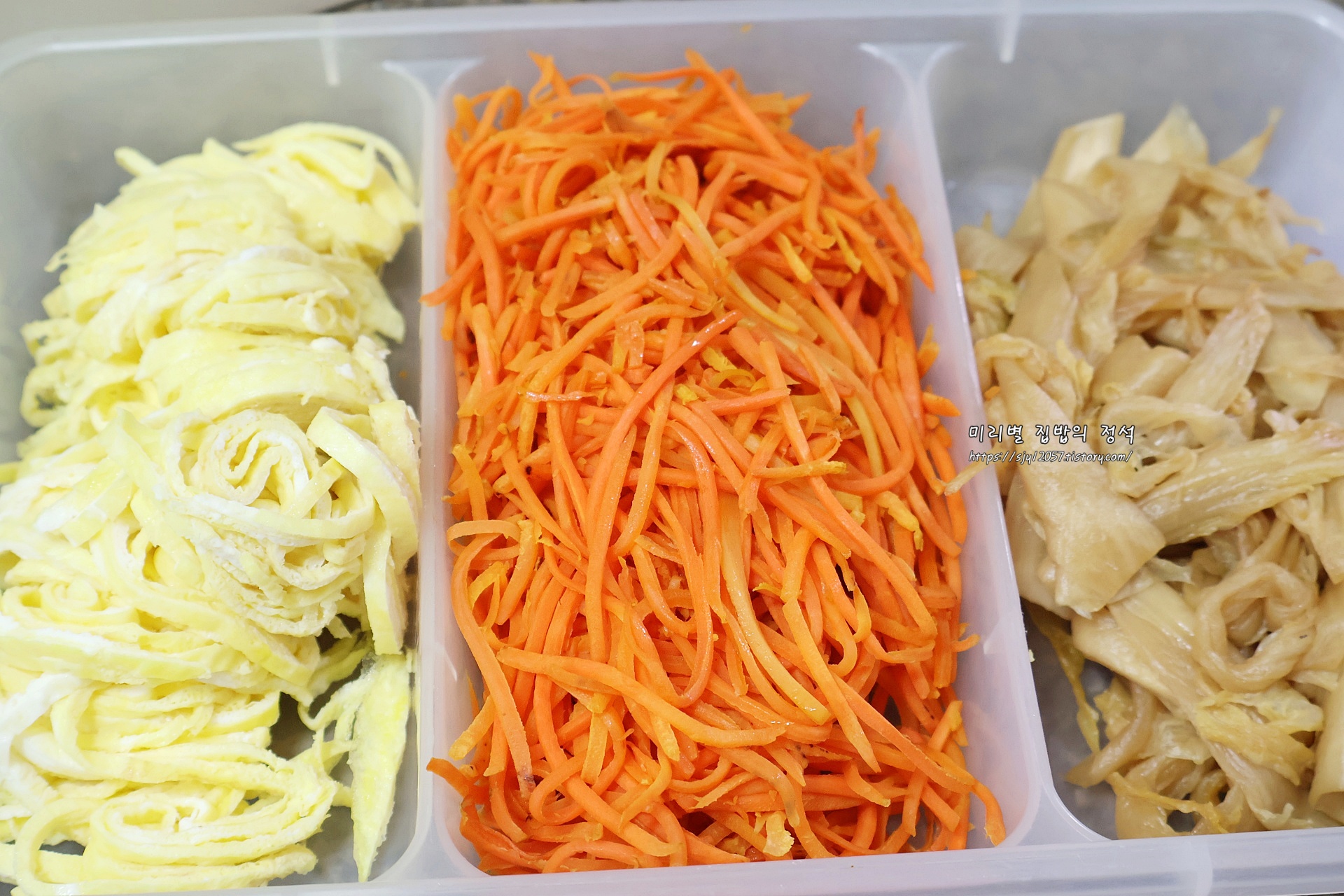 당근은 가늘게 채 썰어 소금 약간 넣어 볶아 단맛과 식감을 살려줍니다.