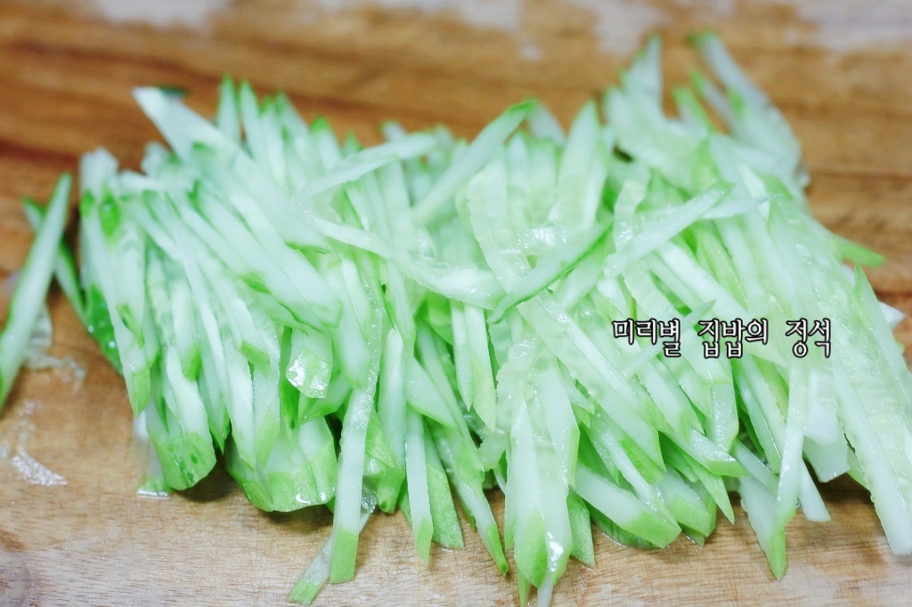 오이는 여러 등분으로 썰어 돌려깎기한 후 채썰어주셔도 되세요~