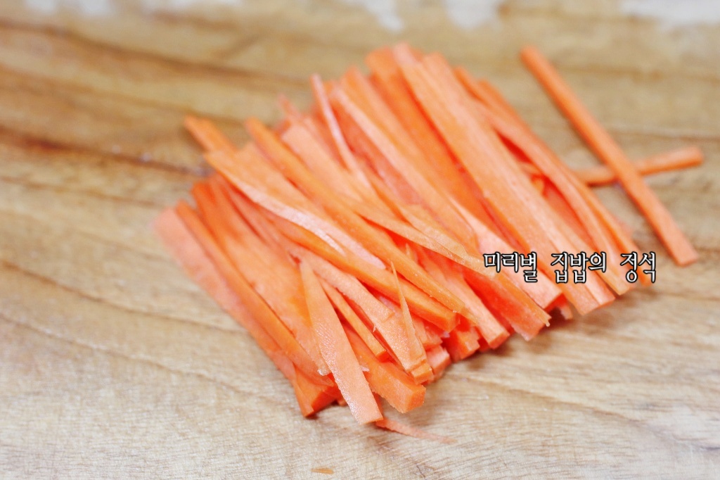 당근은 감자필러로 껍질을 벗겨 가늘게 채썰어주고