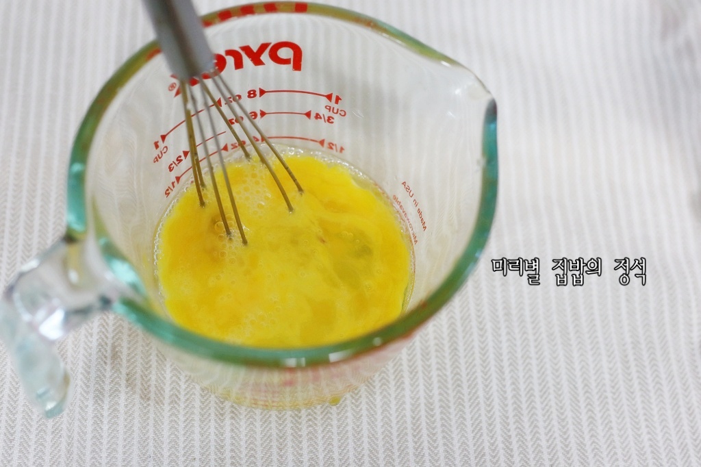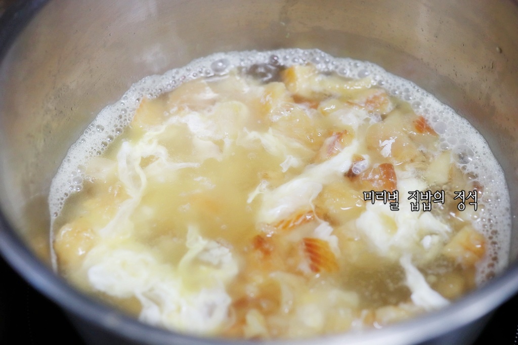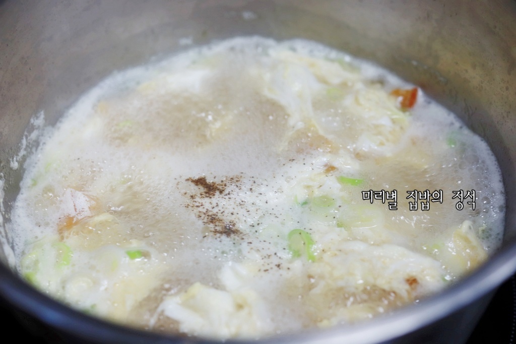 육수가 끓기 시작하면 계란물을 빙 둘러 넣어주는데