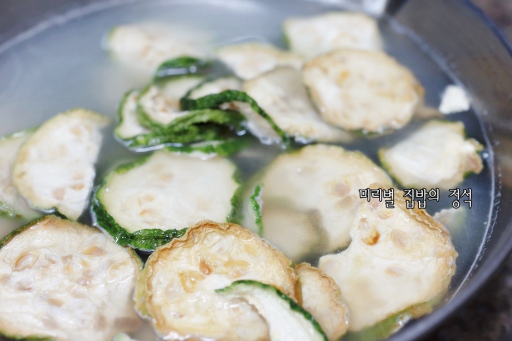 호박고지가 잠길 정도의 넉넉한 미지근한 쌀뜨물에 20분간 불려주는데